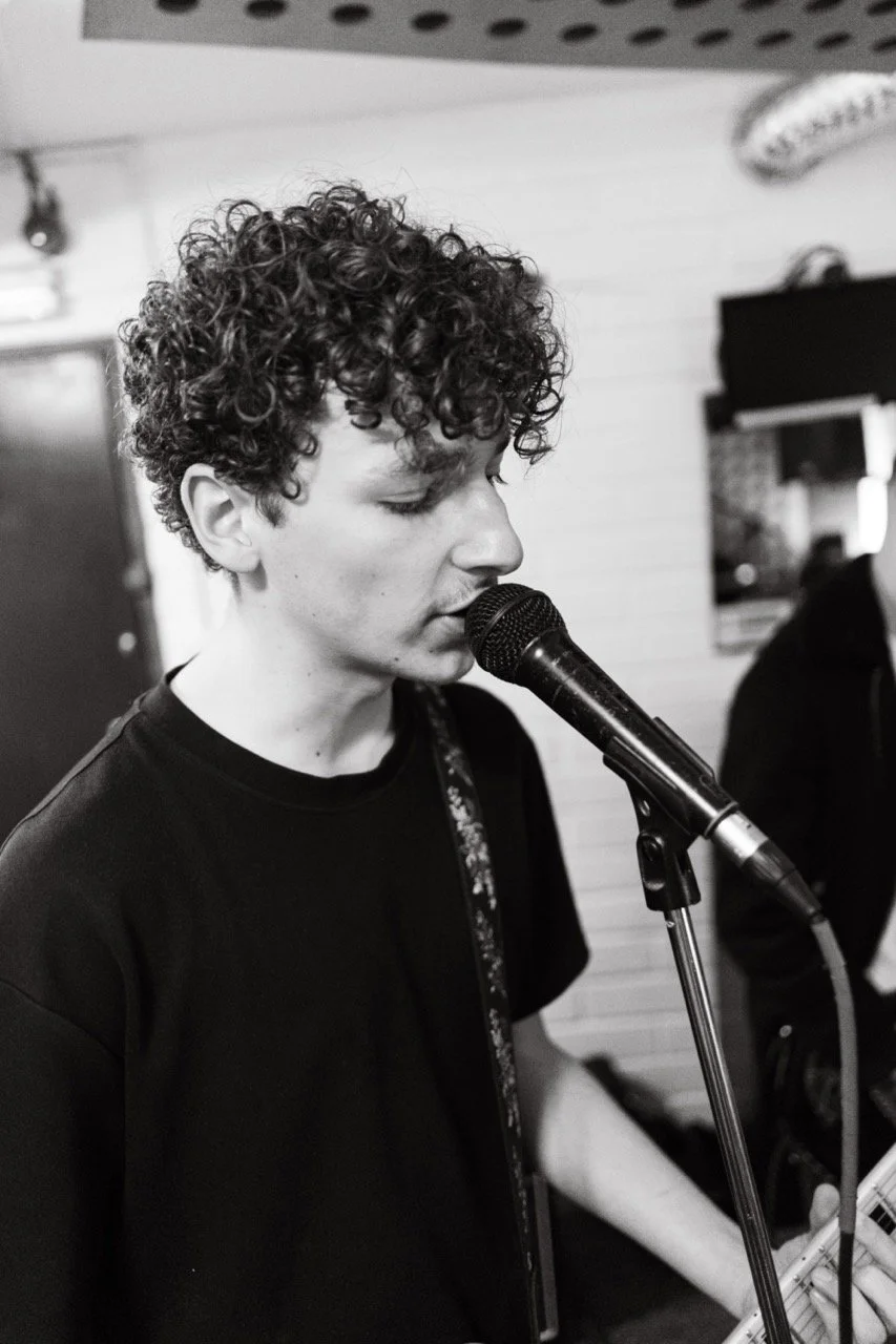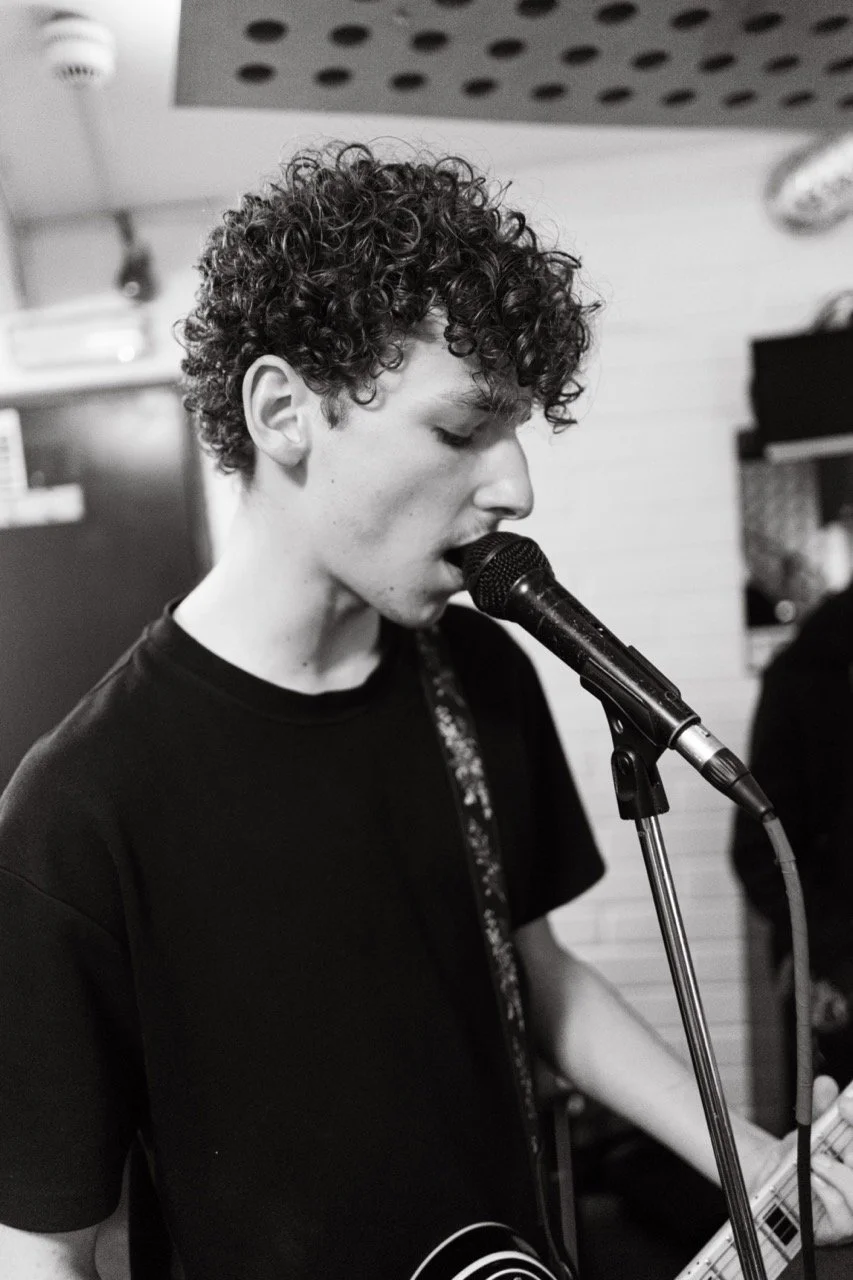 A young man with curly hair singing into a microphone while playing guitar in a black-and-white photo.