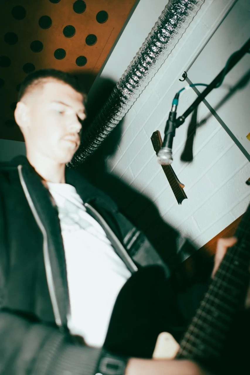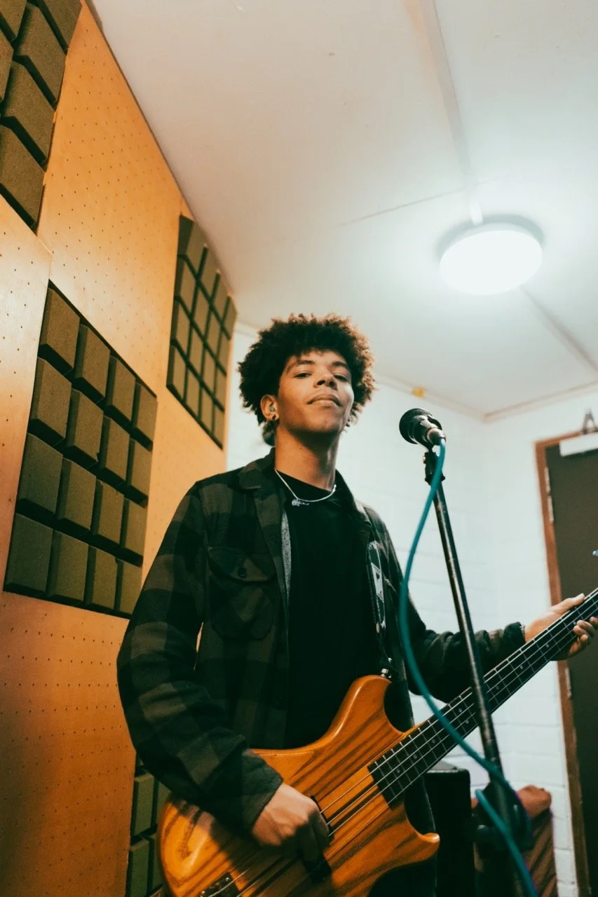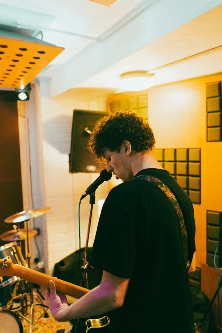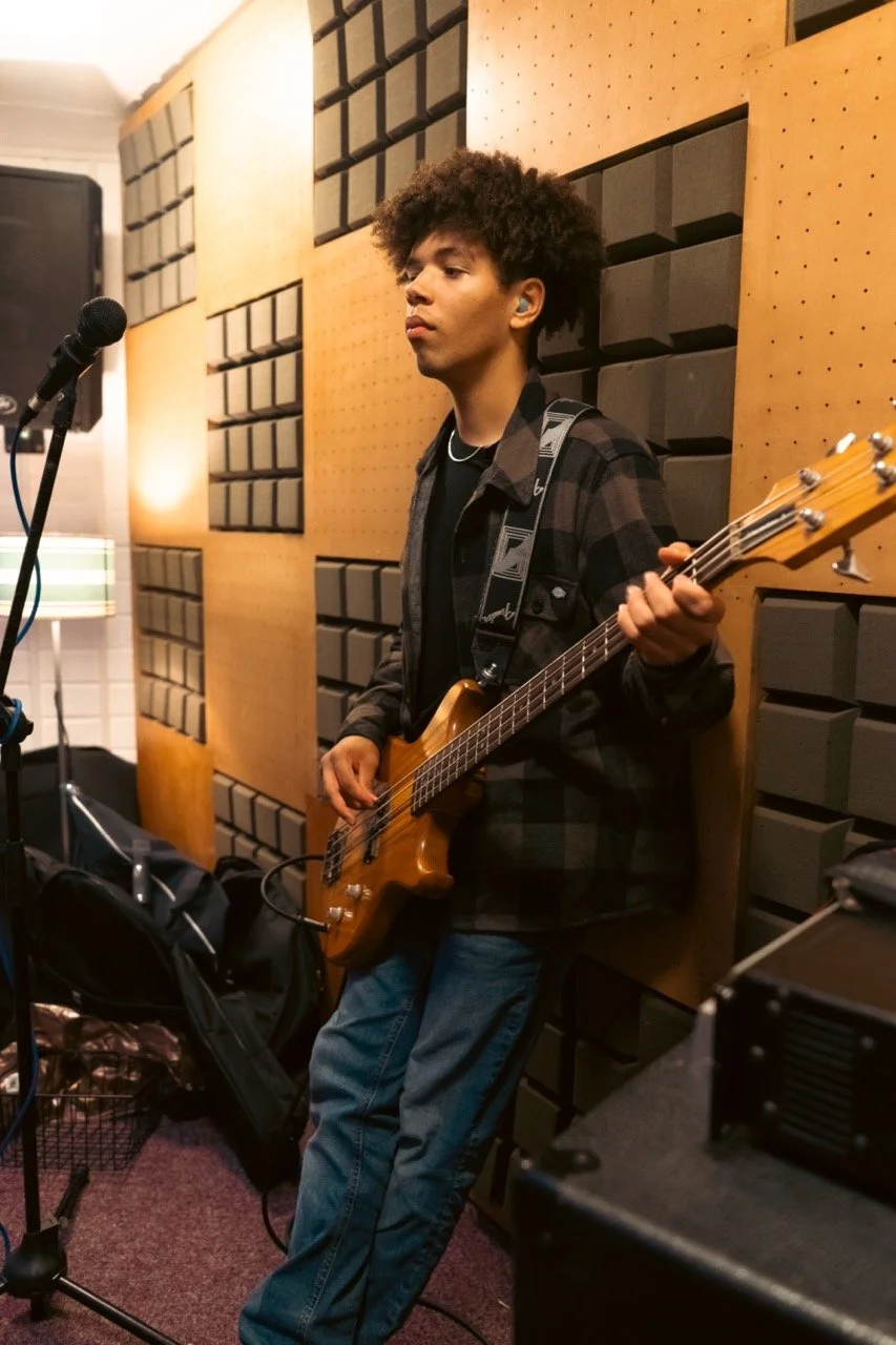 Young man with curly hair playing bass guitar in a music rehearsal room.
