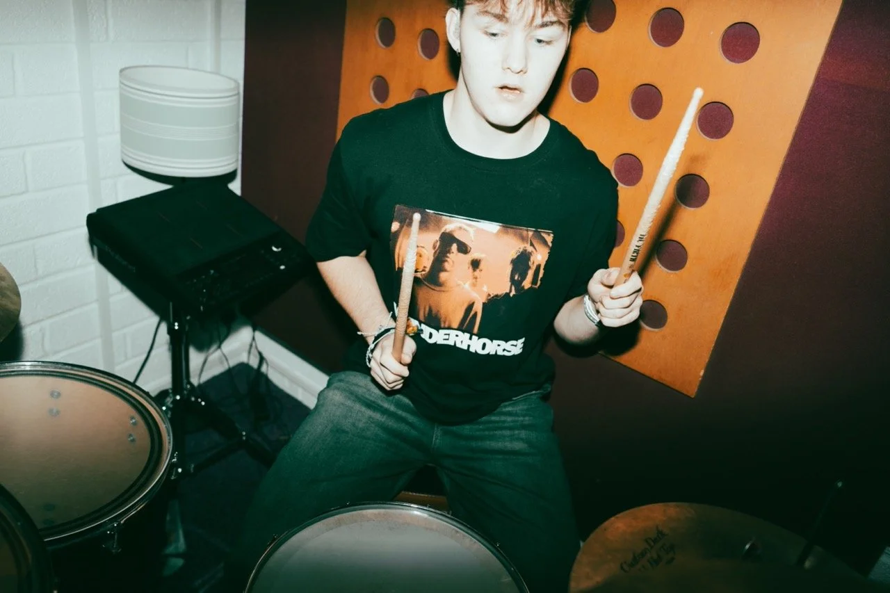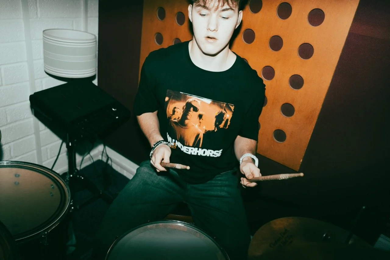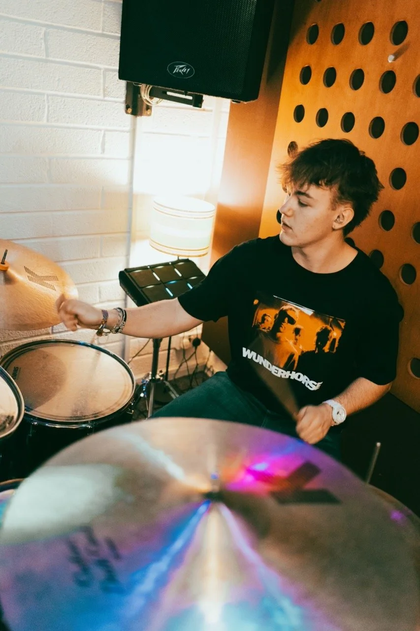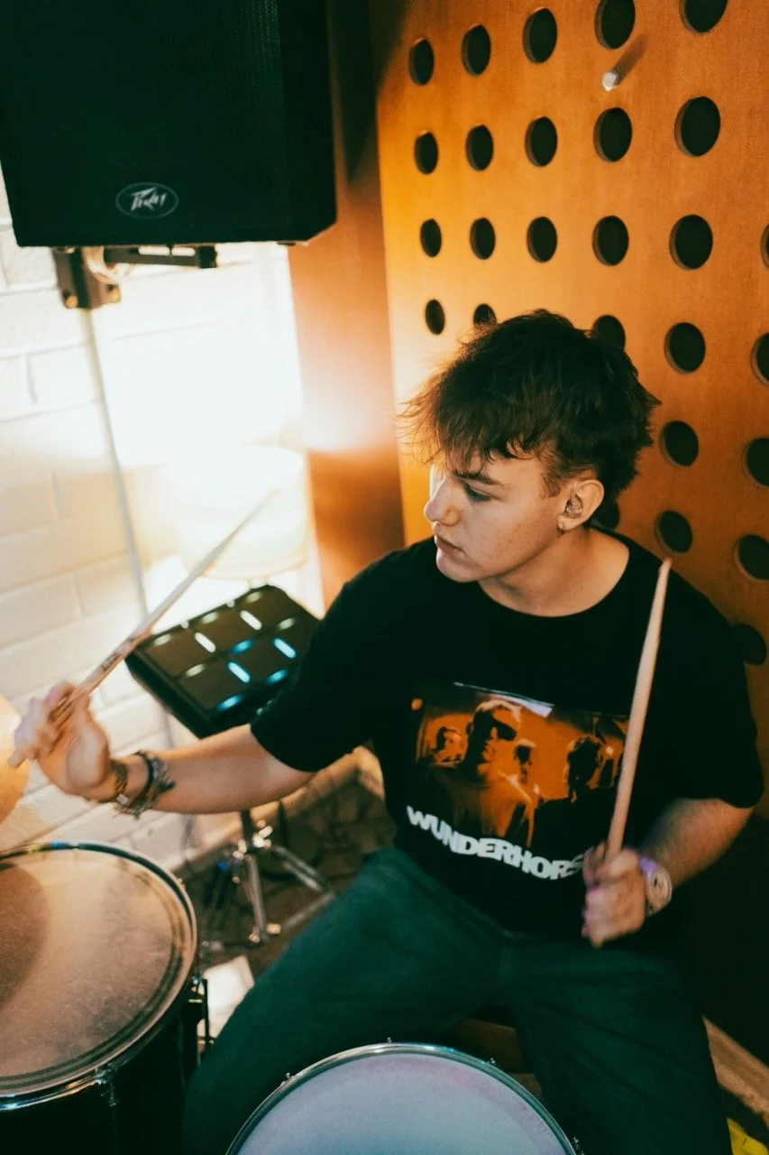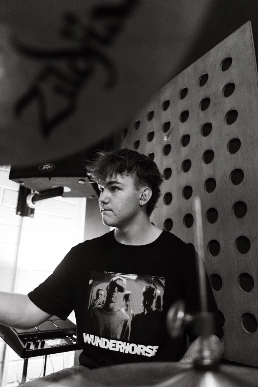 A young man playing drums in a music studio, wearing a black T-shirt with a colorful graphic and the word 'Wunderhorse'. He is sitting next to a white brick wall, with a speaker and a lamp behind him.