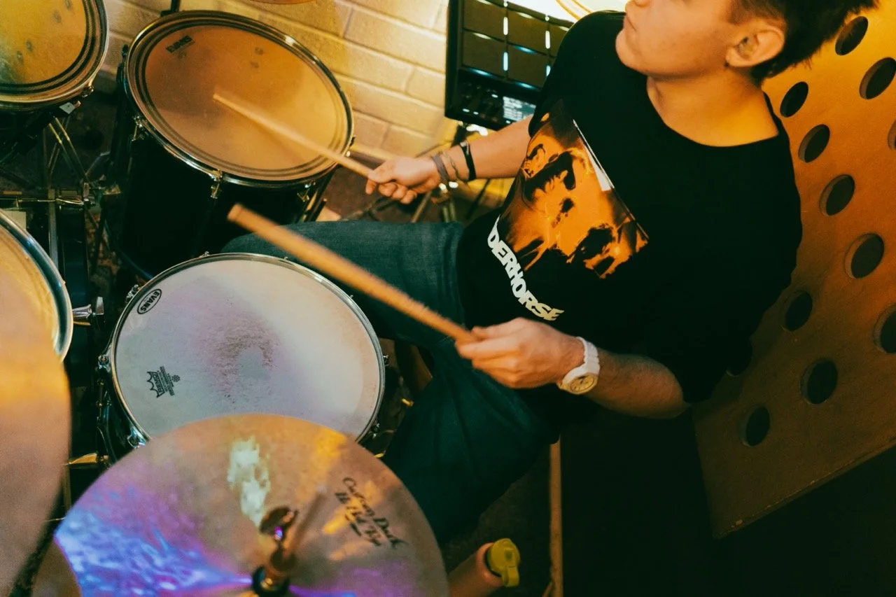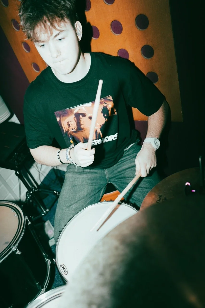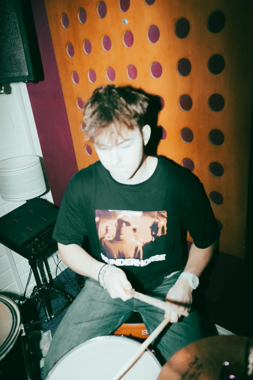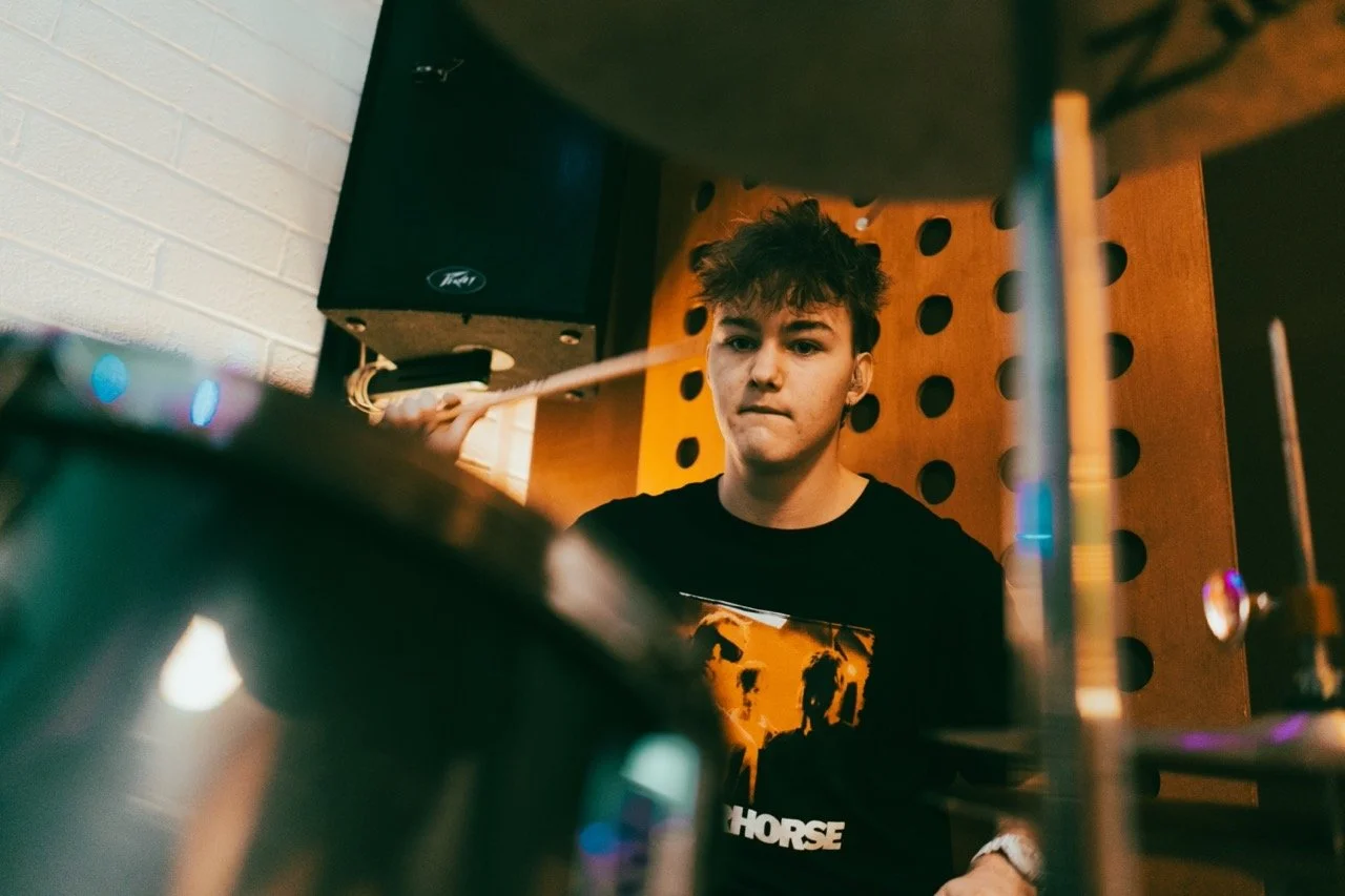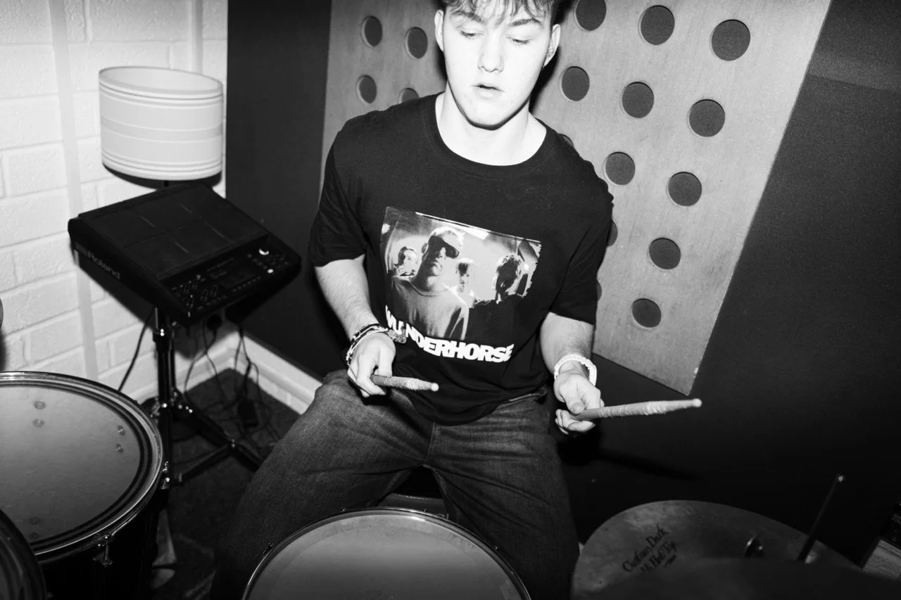 A young man playing drums in a music studio, wearing a black T-shirt with a colorful graphic and the word 'Wunderhorse'. He is sitting next to a white brick wall, with a speaker and a lamp behind him.