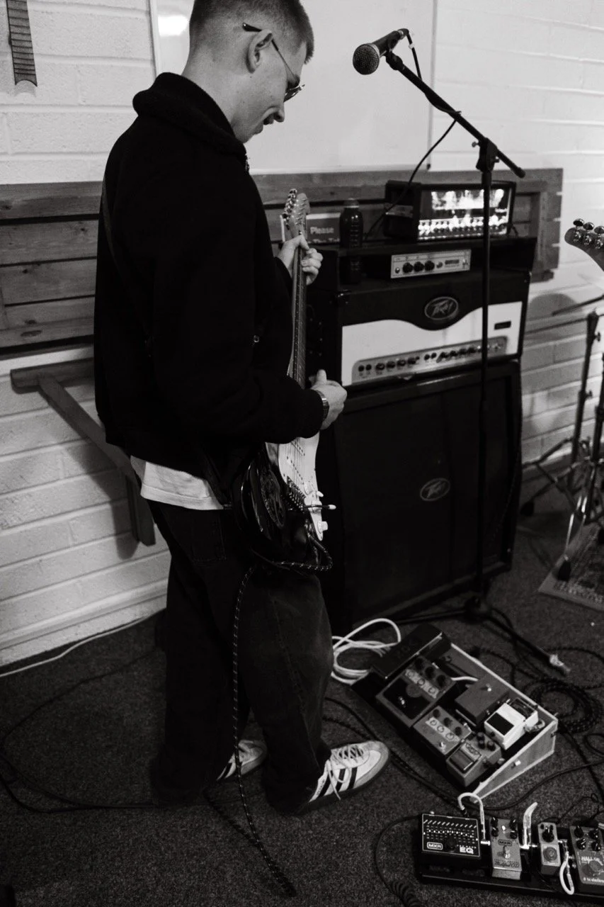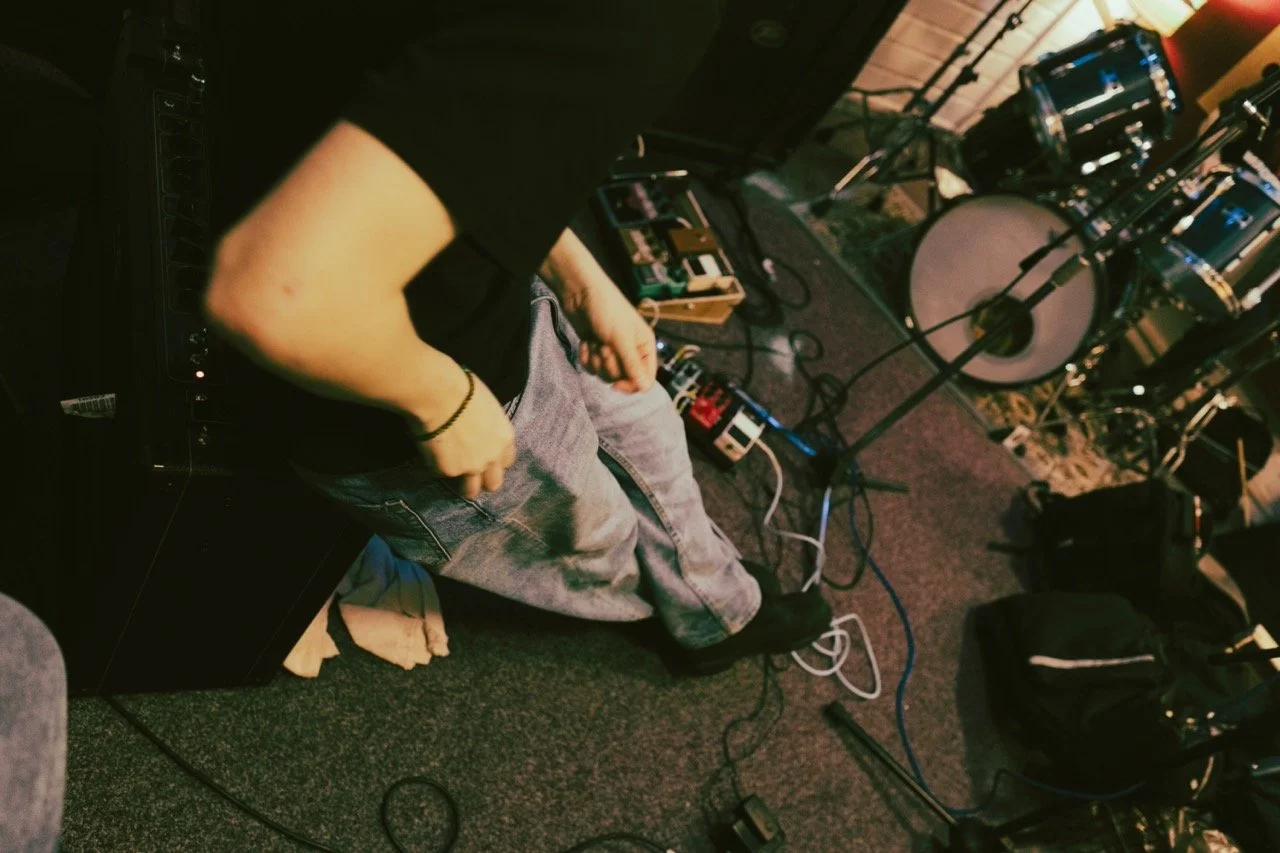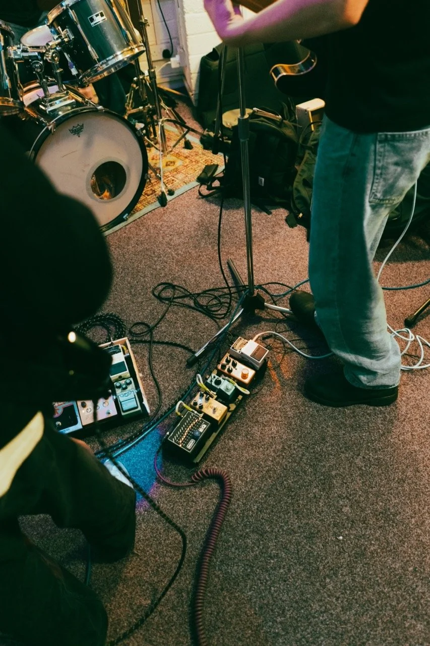 Musicians' setup with guitar, drum kit, and effects pedals on the floor in a rehearsal space.