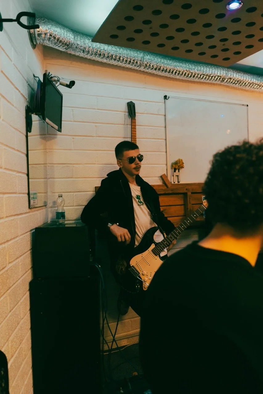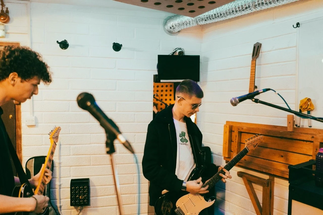 Two musicians playing electric guitars in a music rehearsal space with white brick walls and musical equipment.