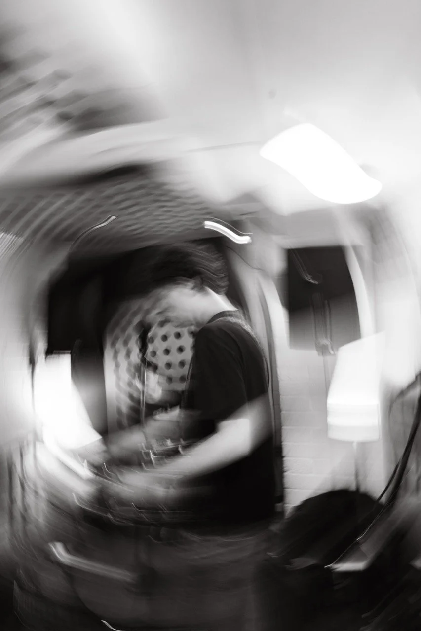 A person taking a selfie in a mirror with a swirling, distorted effect in black and white.