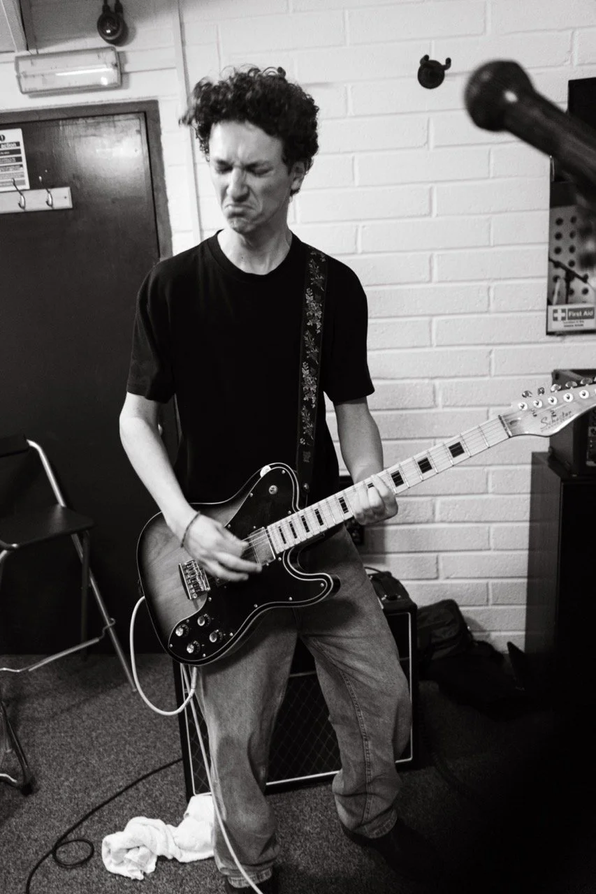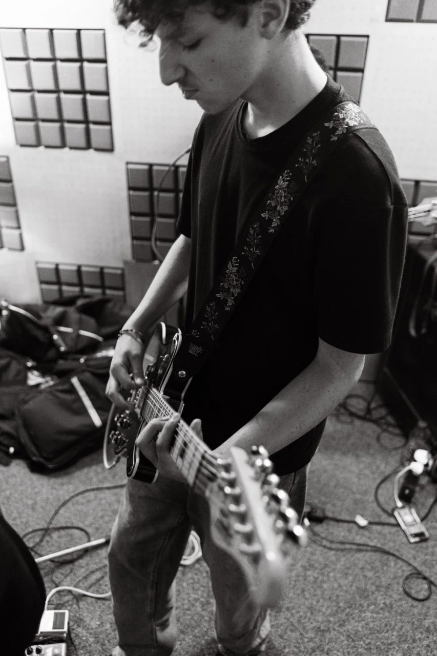 A young man with curly hair playing an electric guitar in a music practice room, with a white brick wall in the background. View fullsize