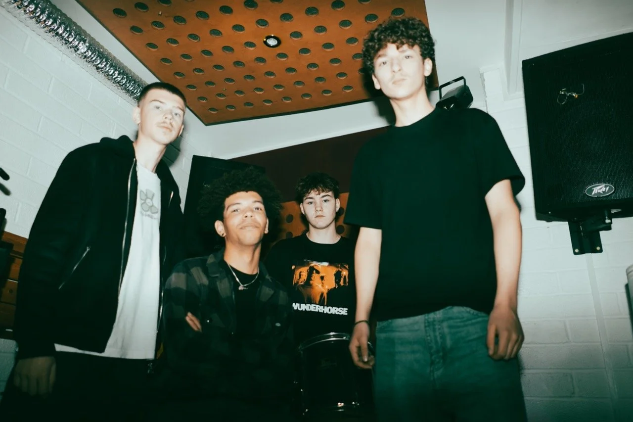 Four young men standing together in a room with white brick walls and speakers, posing for a photo. View fullsize