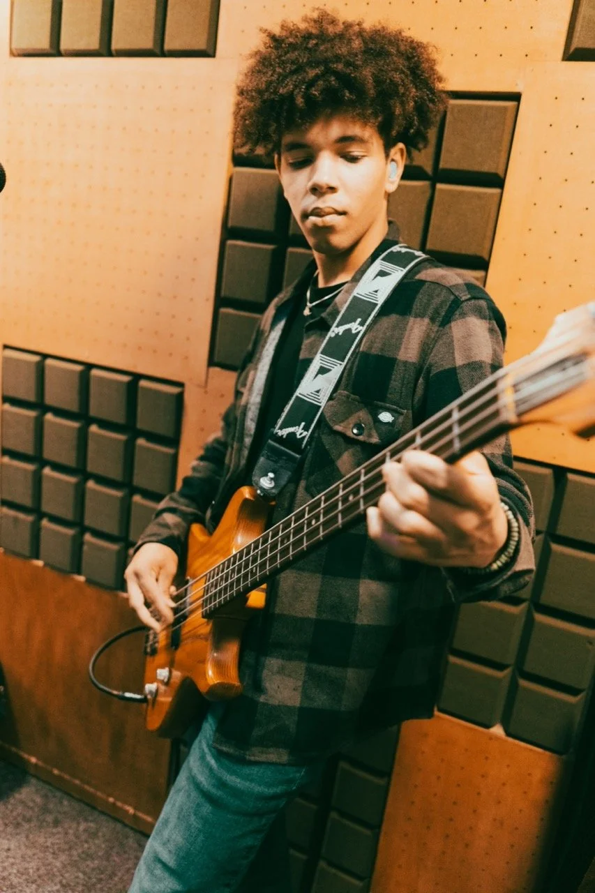 A young man with curly hair is playing a bass guitar in a recording studio, standing against a wall with acoustic foam panels.
