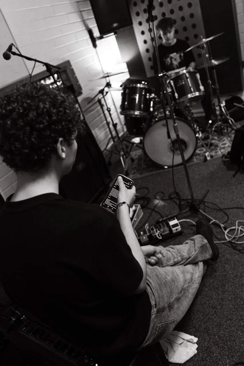 A person with curly hair sitting on the floor in a music studio, looking at a phone, with a drum set and music equipment in the background. View fullsize