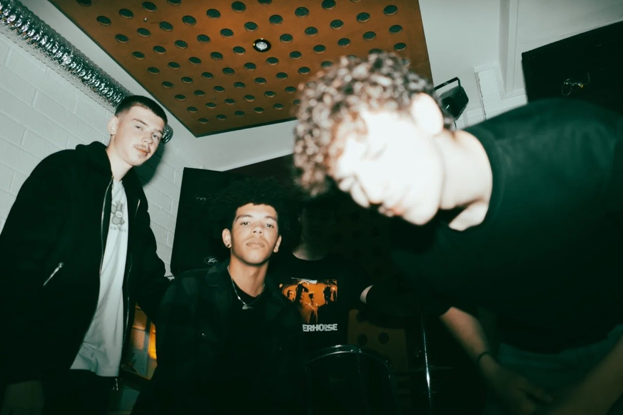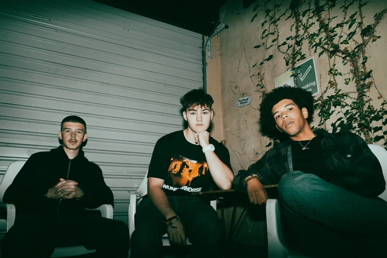 Three young men in a room with a wooden ceiling with holes and a white brick wall. One on the left in a black hoodie, one in the center with a dark shirt and short hair, and one on the right with curly hair, glasses, and a black shirt. The person on