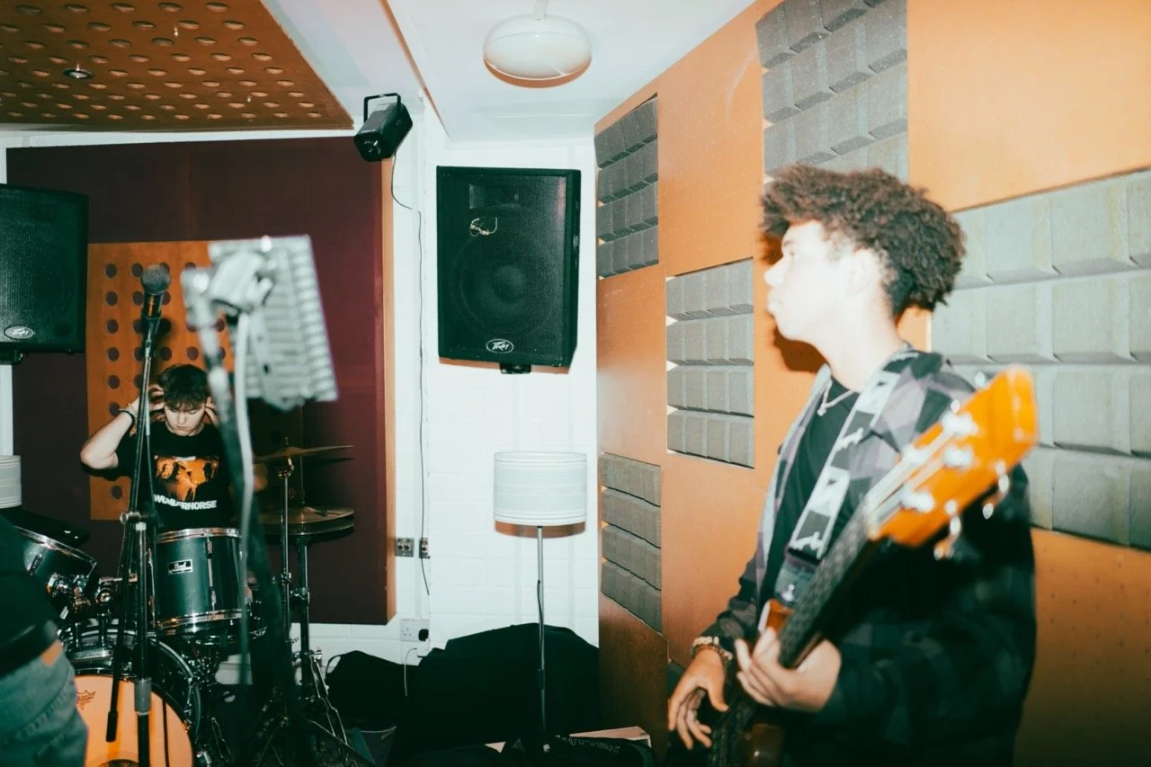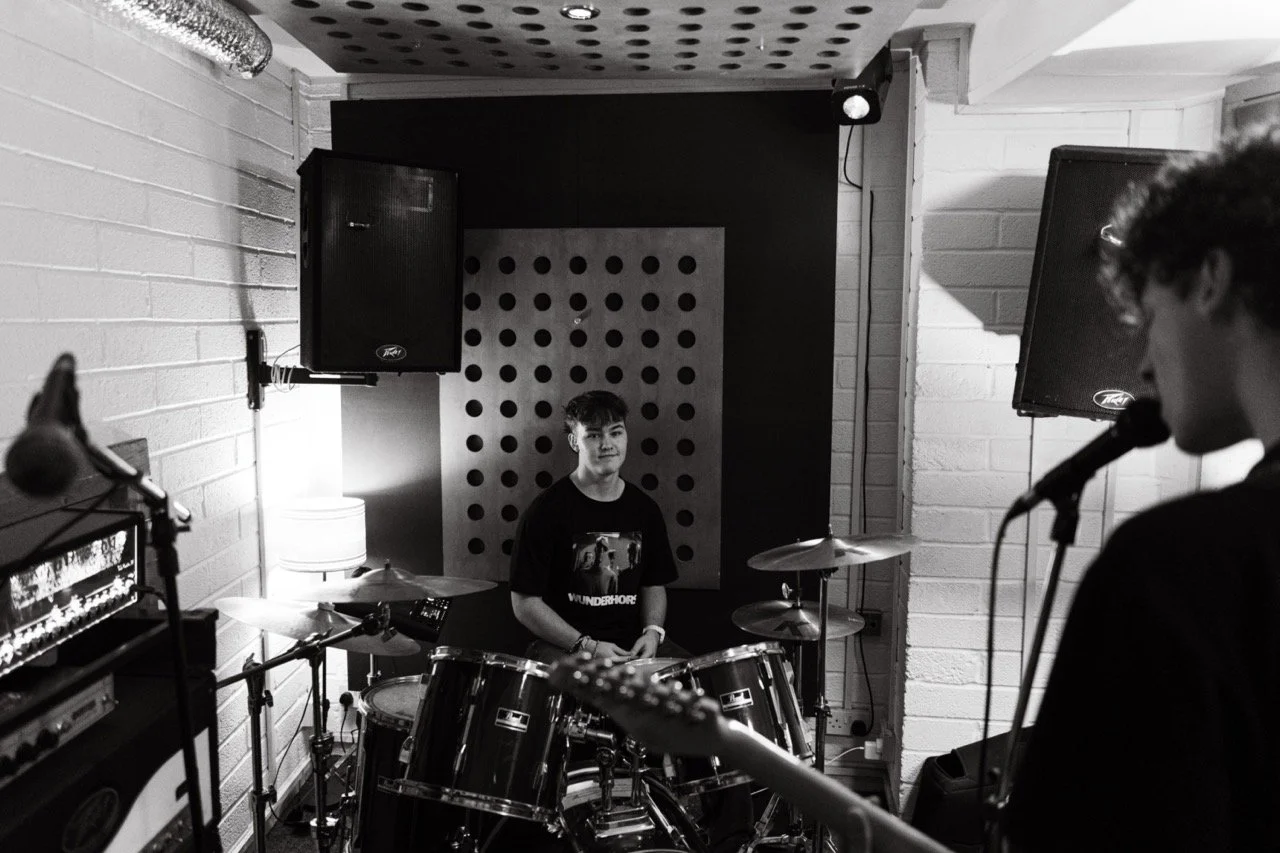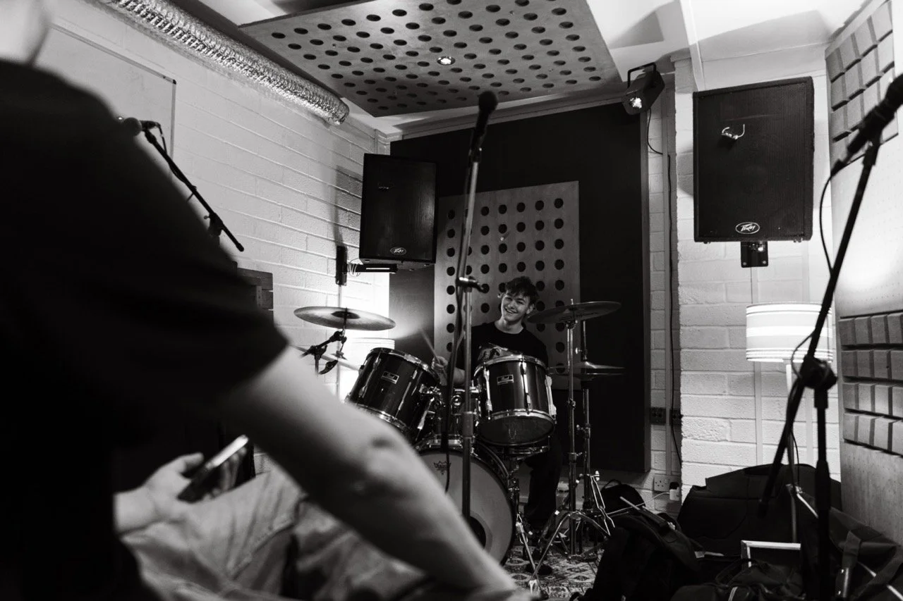 Young man sitting at a drum set in a music rehearsal space, with another person singing into a microphone in the foreground.