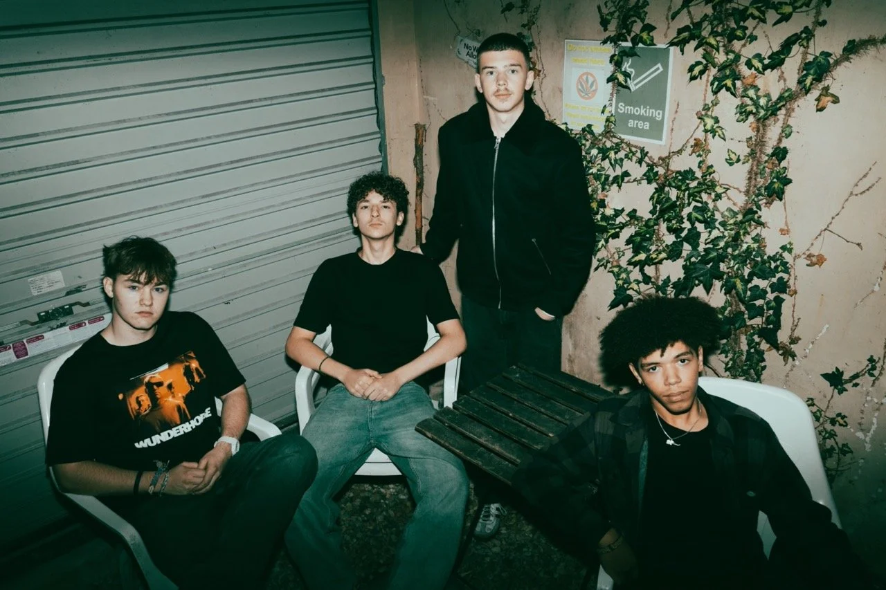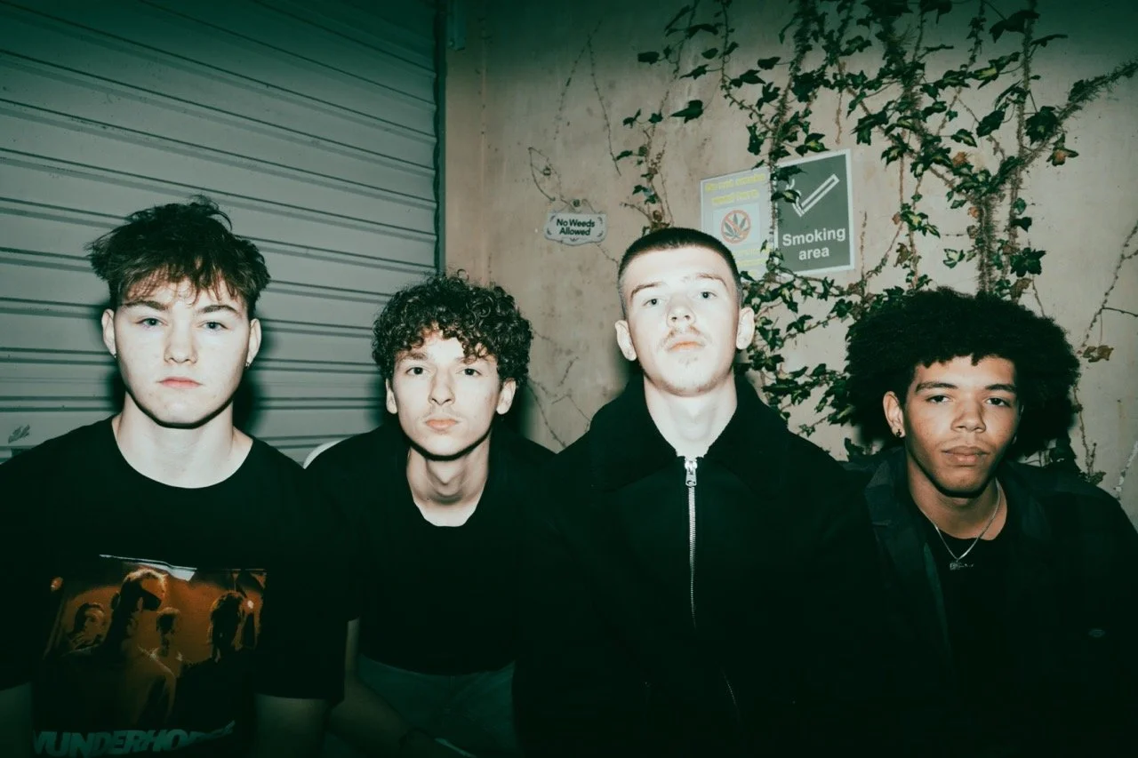 Four young men in casual clothing standing indoors, with a white brick wall, wooden ceiling with circular cutouts, and a large speaker in the background.