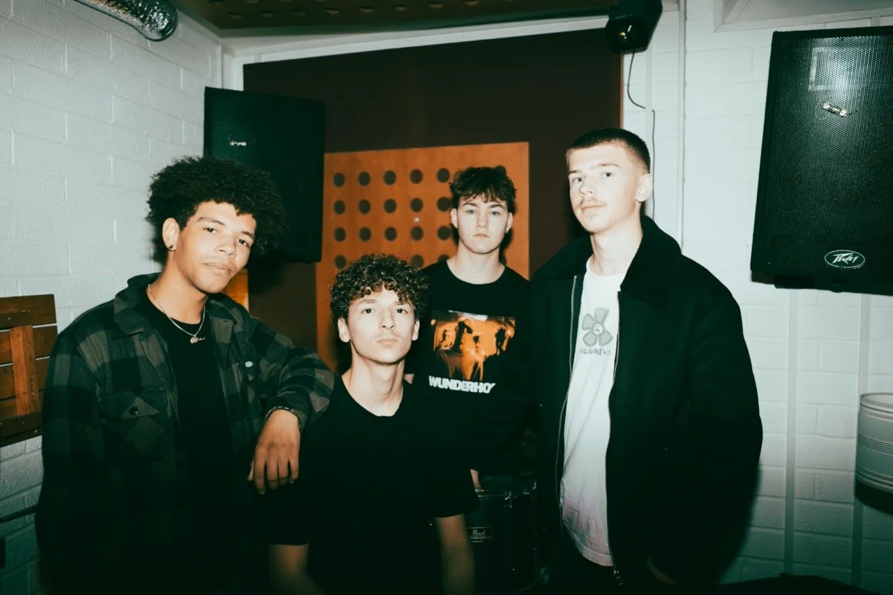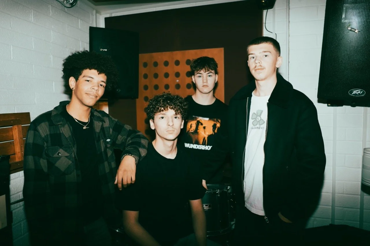 Four young men standing together in a room with white brick walls and speakers, posing for a photo.
