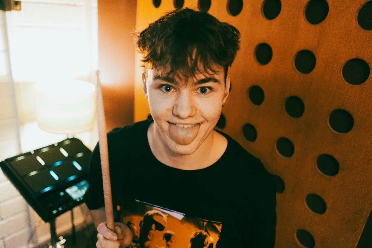 A young man with white skin and light brown hair playing a drum kit, holding drumsticks in each hand, in a room with dark and orange wall decor.