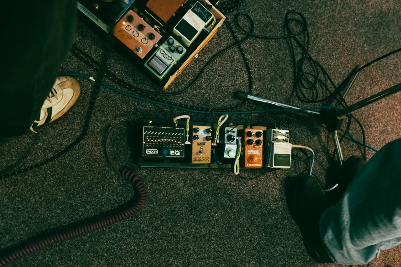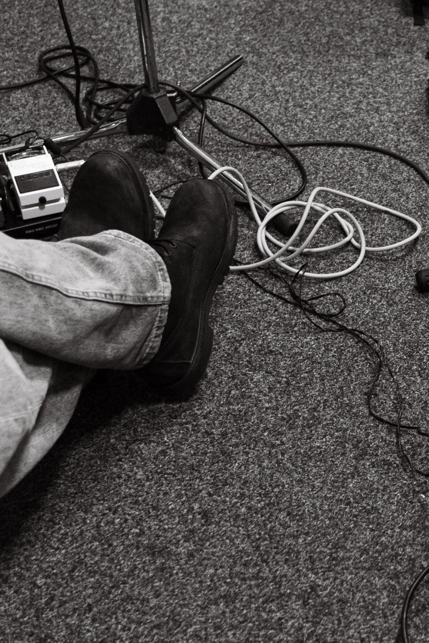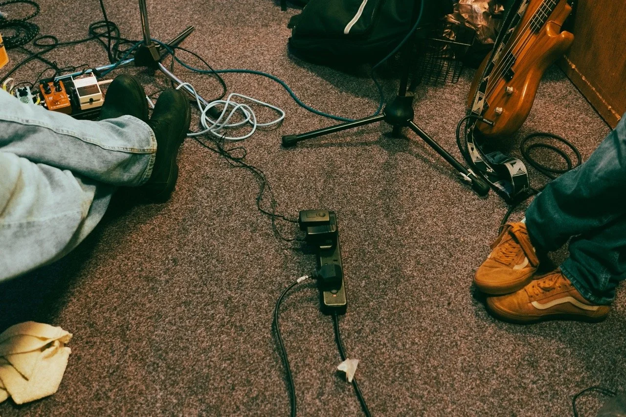 Close-up view of a music practice room with two people, one wearing black shoes and the other brown sneakers, sitting on a carpeted floor surrounded by musical equipment. There are guitar pedals, a microphone stand, a guitar, and various cables scatt