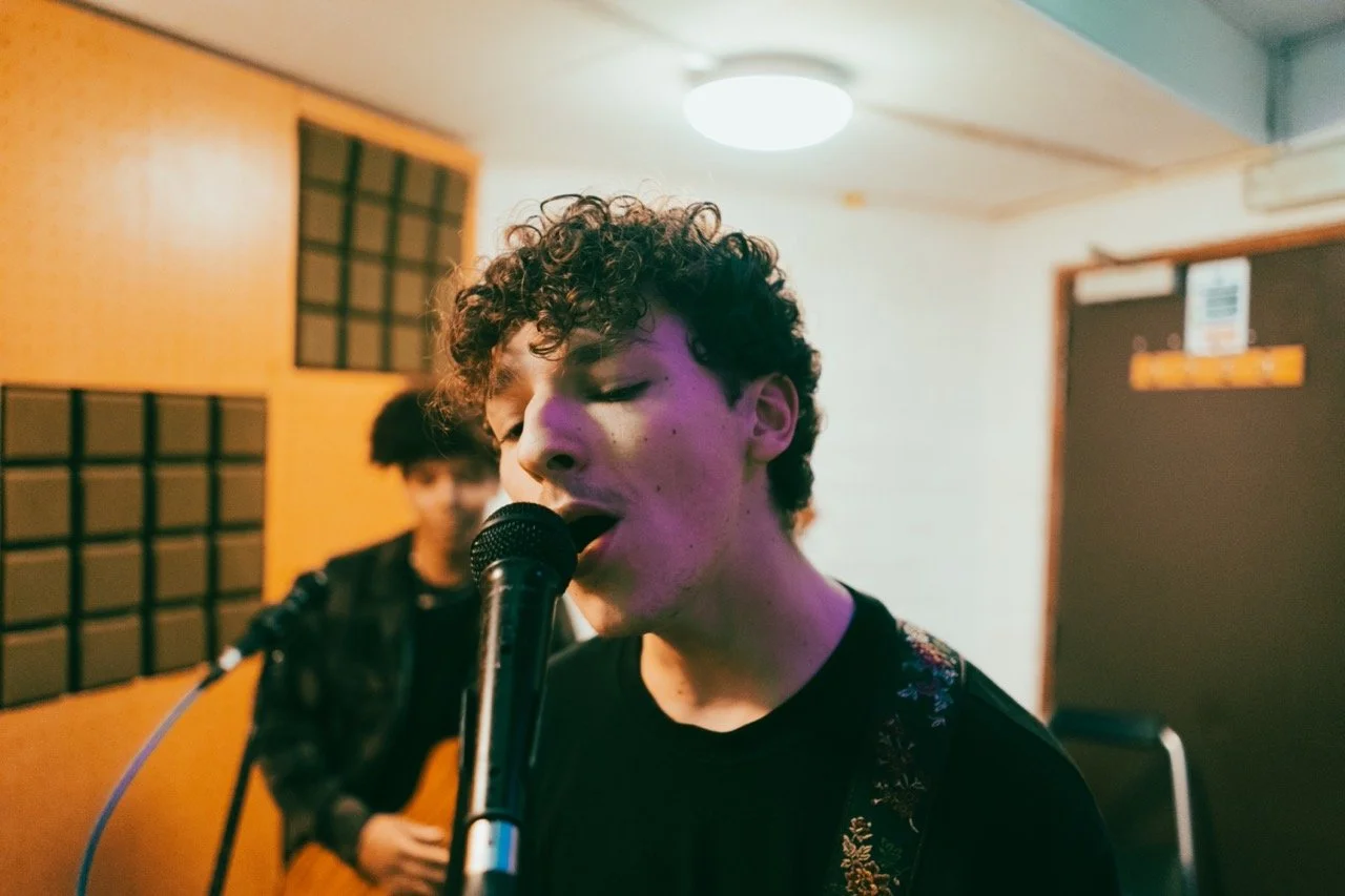 A young man with curly hair playing an electric guitar and singing into a microphone in a music studio, with drums and soundproofing panels in the background.
