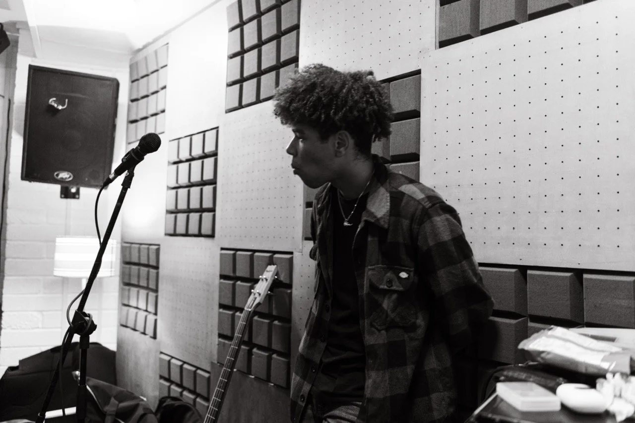 A young man standing in a music studio next to a microphone and acoustic foam panels on the wall, with a guitar leaning against the wall and music equipment on a desk.