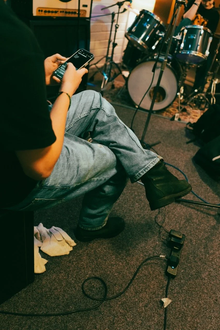 Person sitting with crossed legs in front of a drum set, using a smartphone, with guitar amplifier and pedals visible in a music rehearsal space.