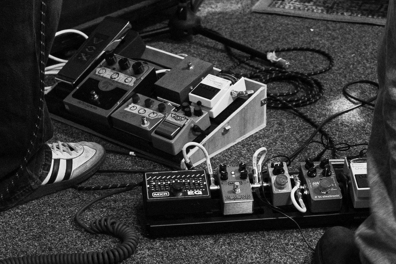 Musicians' setup with guitar, drum kit, and effects pedals on the floor in a rehearsal space. View fullsize