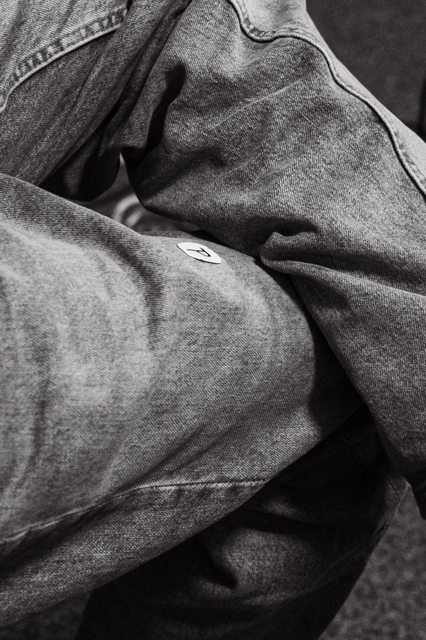 Close-up of a person's lap wearing gray denim jeans with a small white sticker on the thigh area.