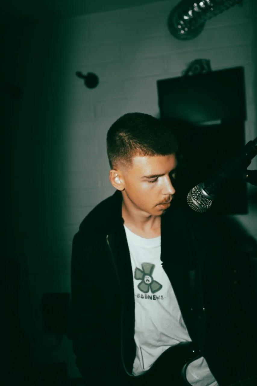 A young man with short dark hair and a mustache wearing a white T-shirt with a face and flowers graphic and a black hoodie, sitting in front of a microphone in a dimly lit room.