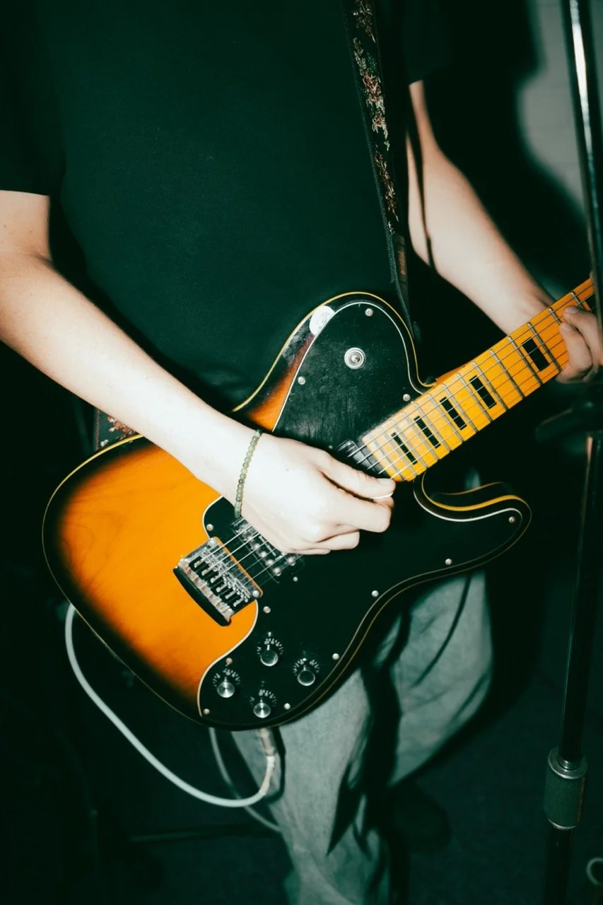 Person playing an electric guitar with a sunburst finish, black pickguard, and control knobs, wearing a black shirt and grey pants.