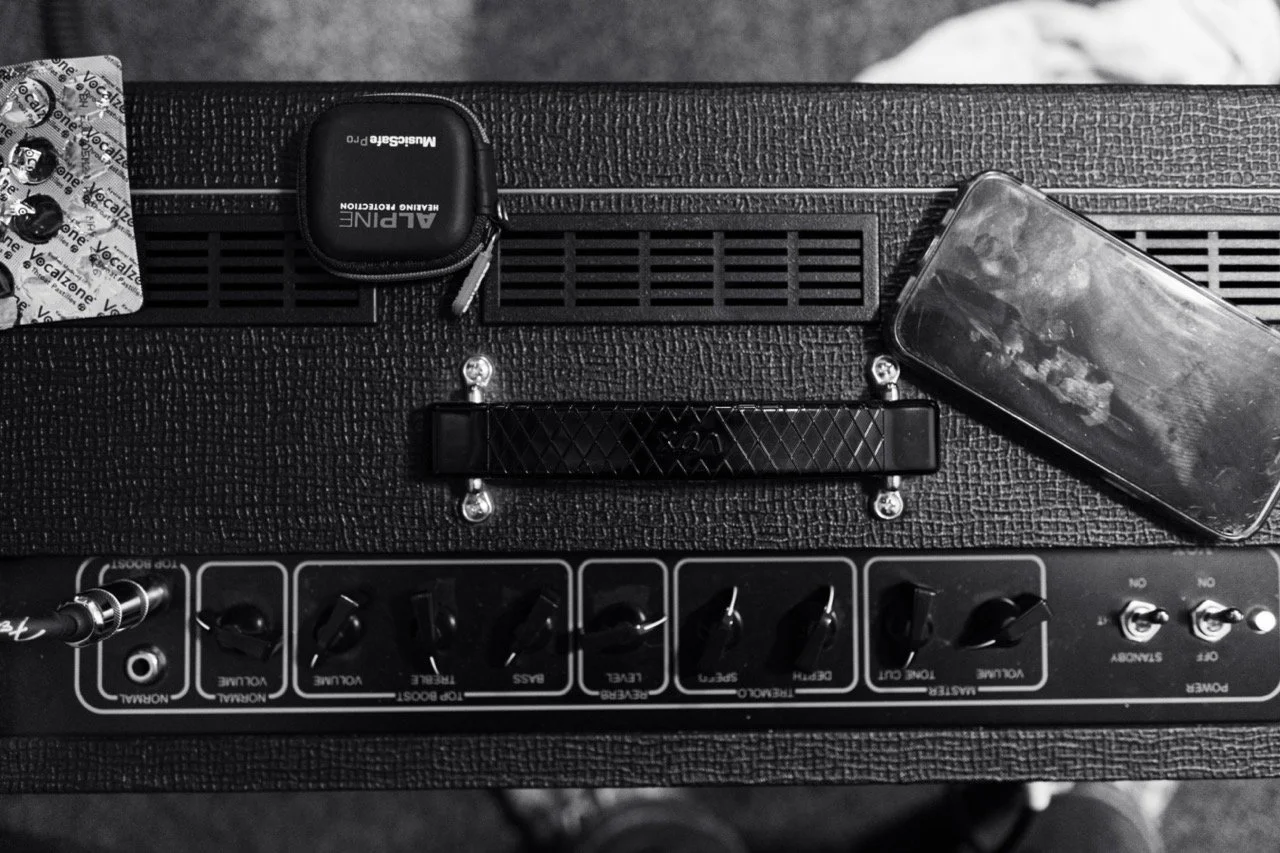 Black guitar amplifier with various control knobs, a wireless receiver, a smartphone with a reflective case, a small black case labeled 'ALPINE HEARING PROTECTION', and an earphone pack on top of the amplifier.