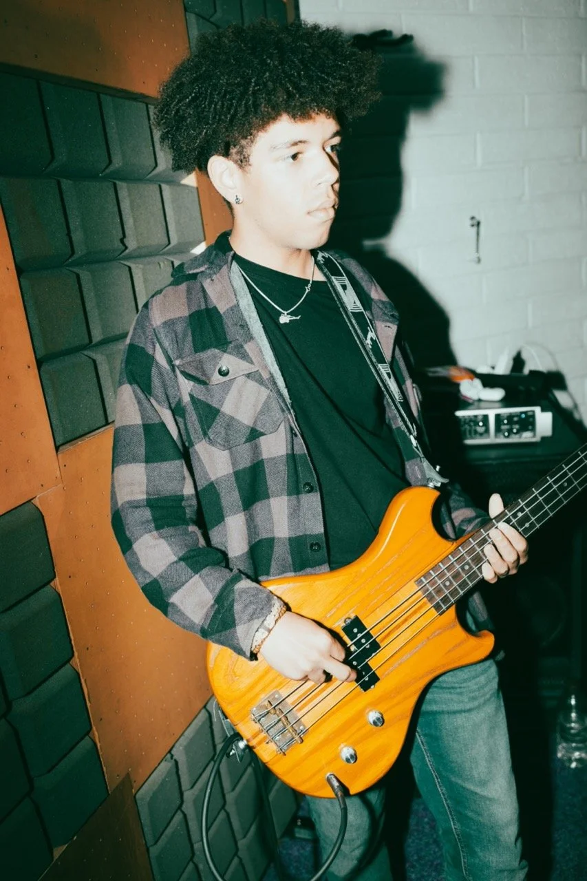Young person with curly hair holding an orange electric bass guitar in a recording studio.