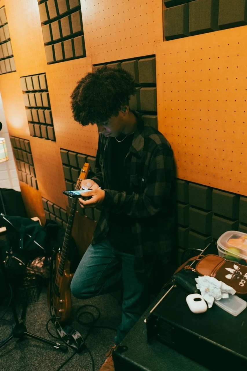 A young person with curly hair in a checkered shirt, looking at a smartphone, standing in a music studio with soundproofing panels, a guitar, and various equipment around.