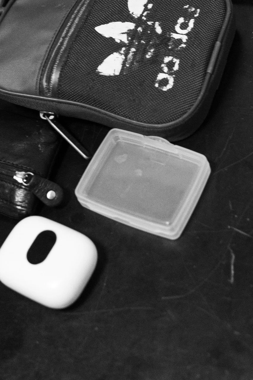 Collection of personal items on a dark surface including a black case with white design, a small empty clear plastic container, a white device with a hole, and a black leather item.