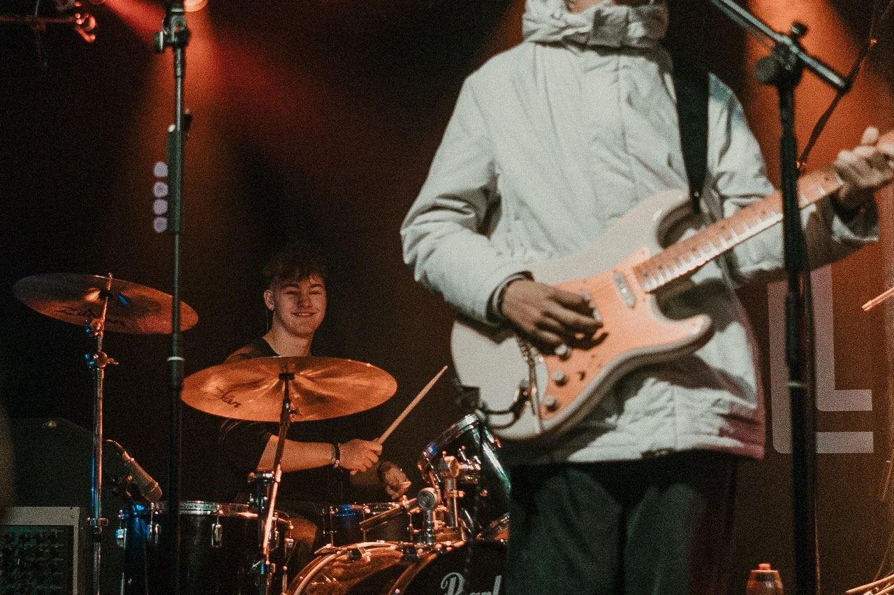 A young musician playing an electric guitar and a young drummer smiling while playing the drums during a live performance on stage.