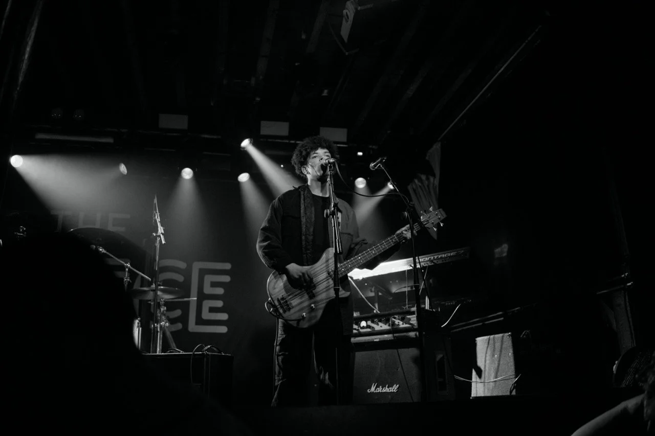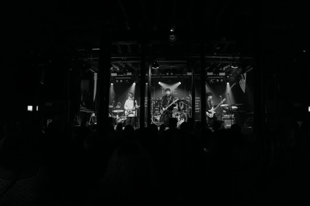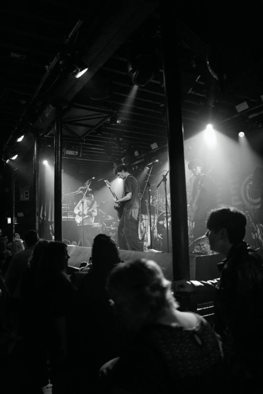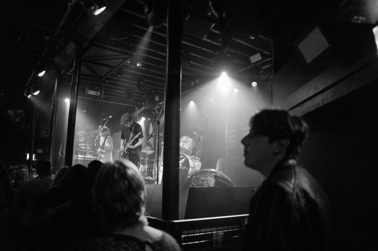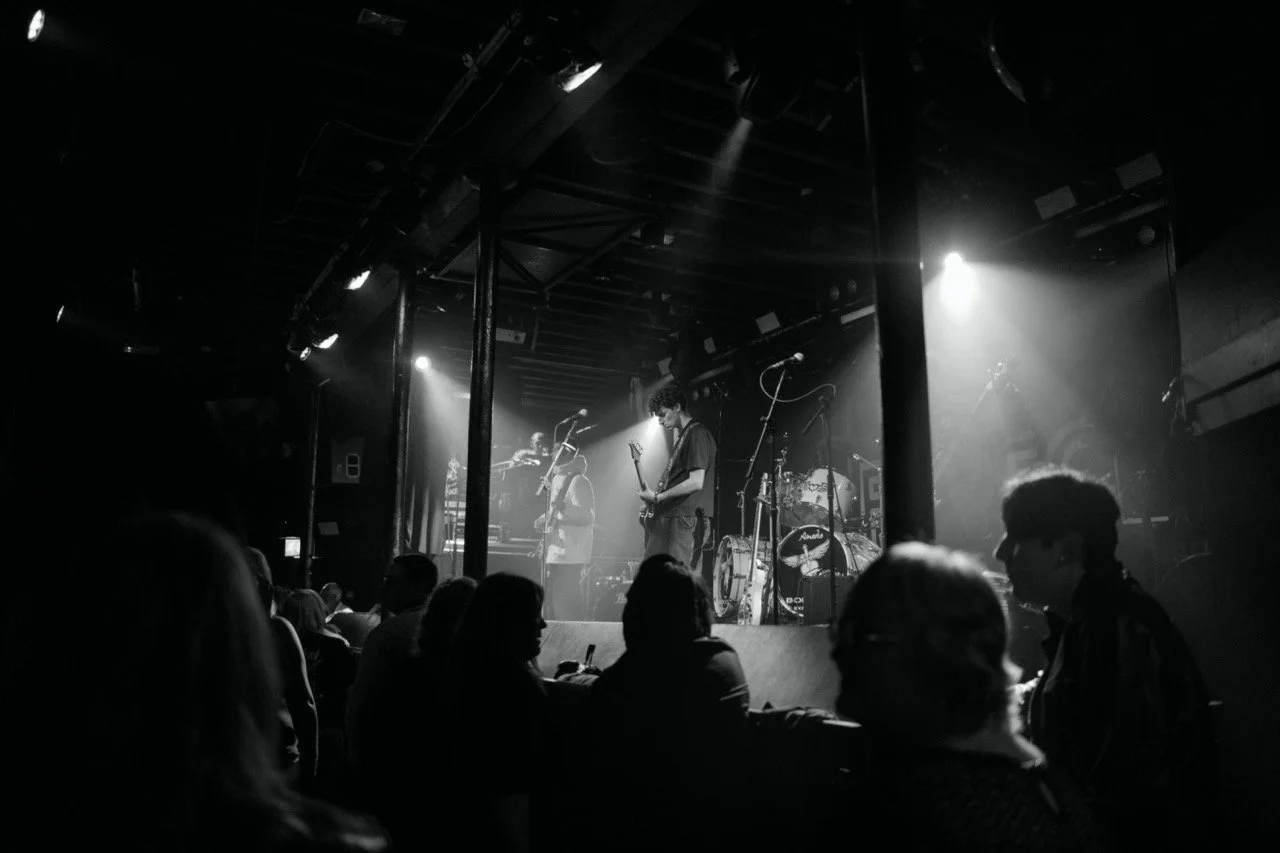 Black and white photo of a live music performance on stage with band members playing instruments and audience watching, dim lighting with spotlights on performers.