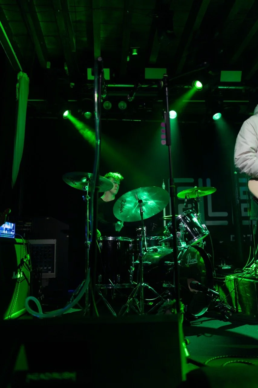 Musicians performing on stage with drums and electric guitar amid green stage lighting. View fullsize