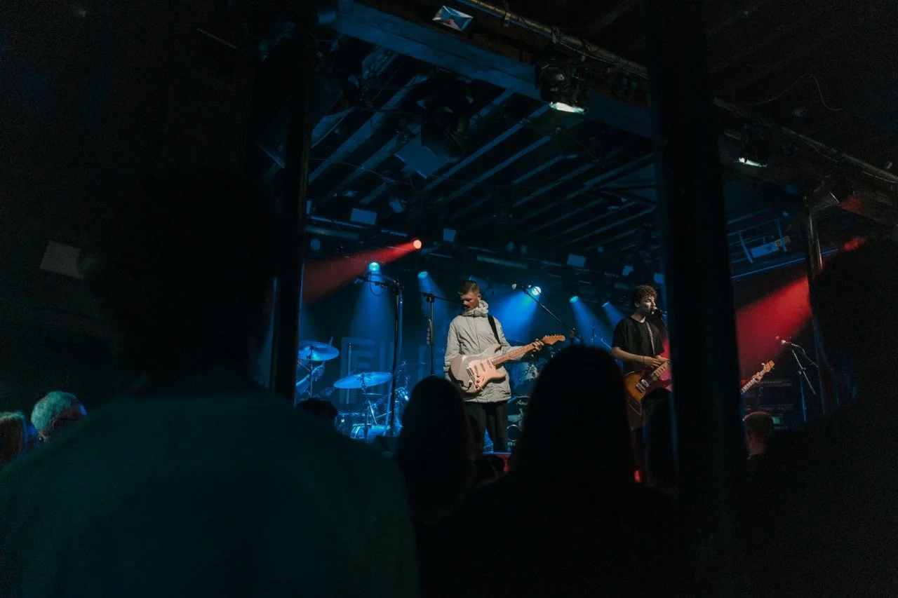 A band performs on stage in a dimly lit venue with blue and red lights, featuring band members playing guitars and drums.