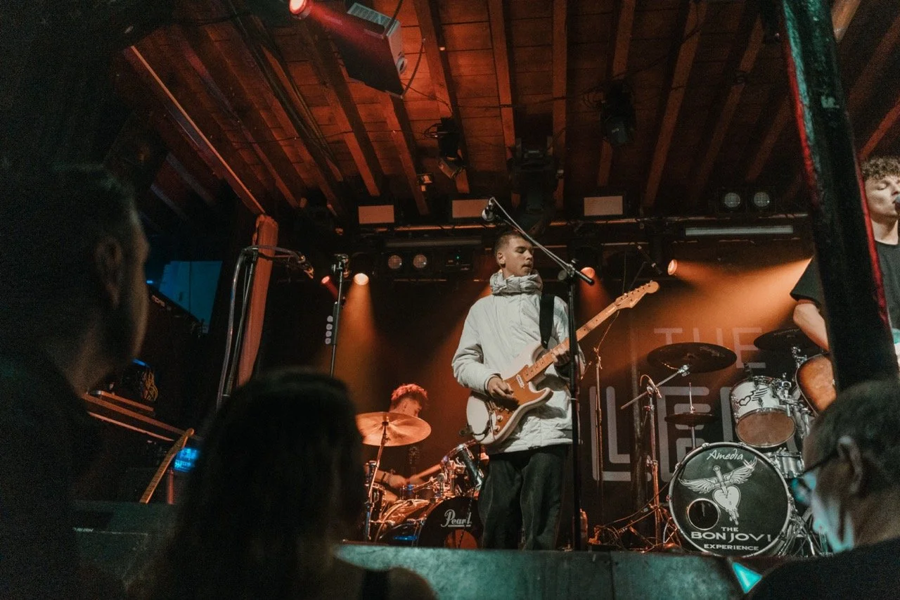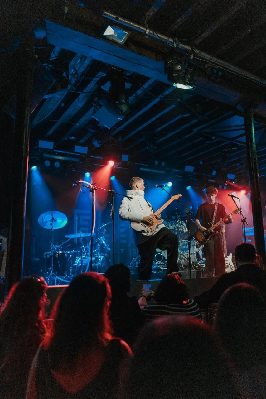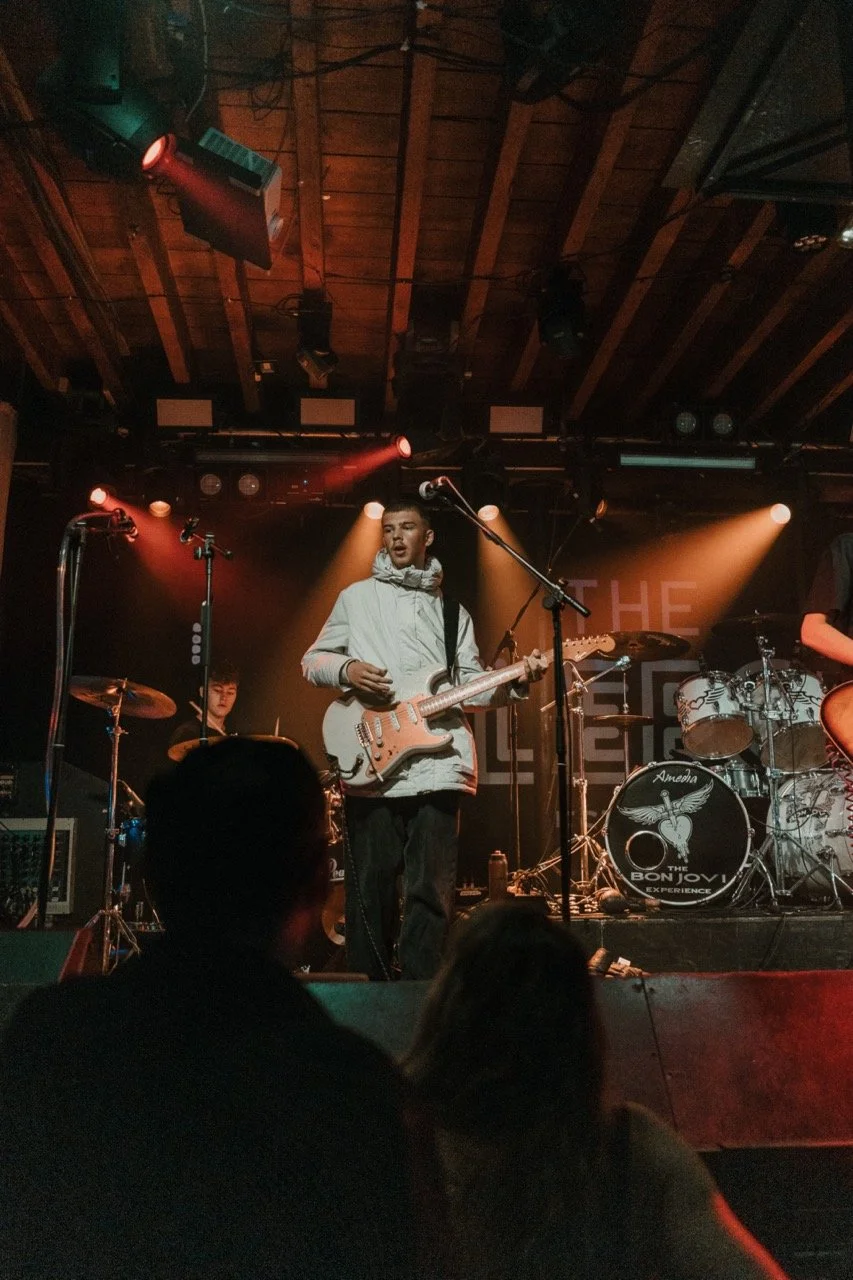 A live music performance in a dimly lit venue with a band on stage, including a guitarist and a drummer, facing an audience. View fullsize