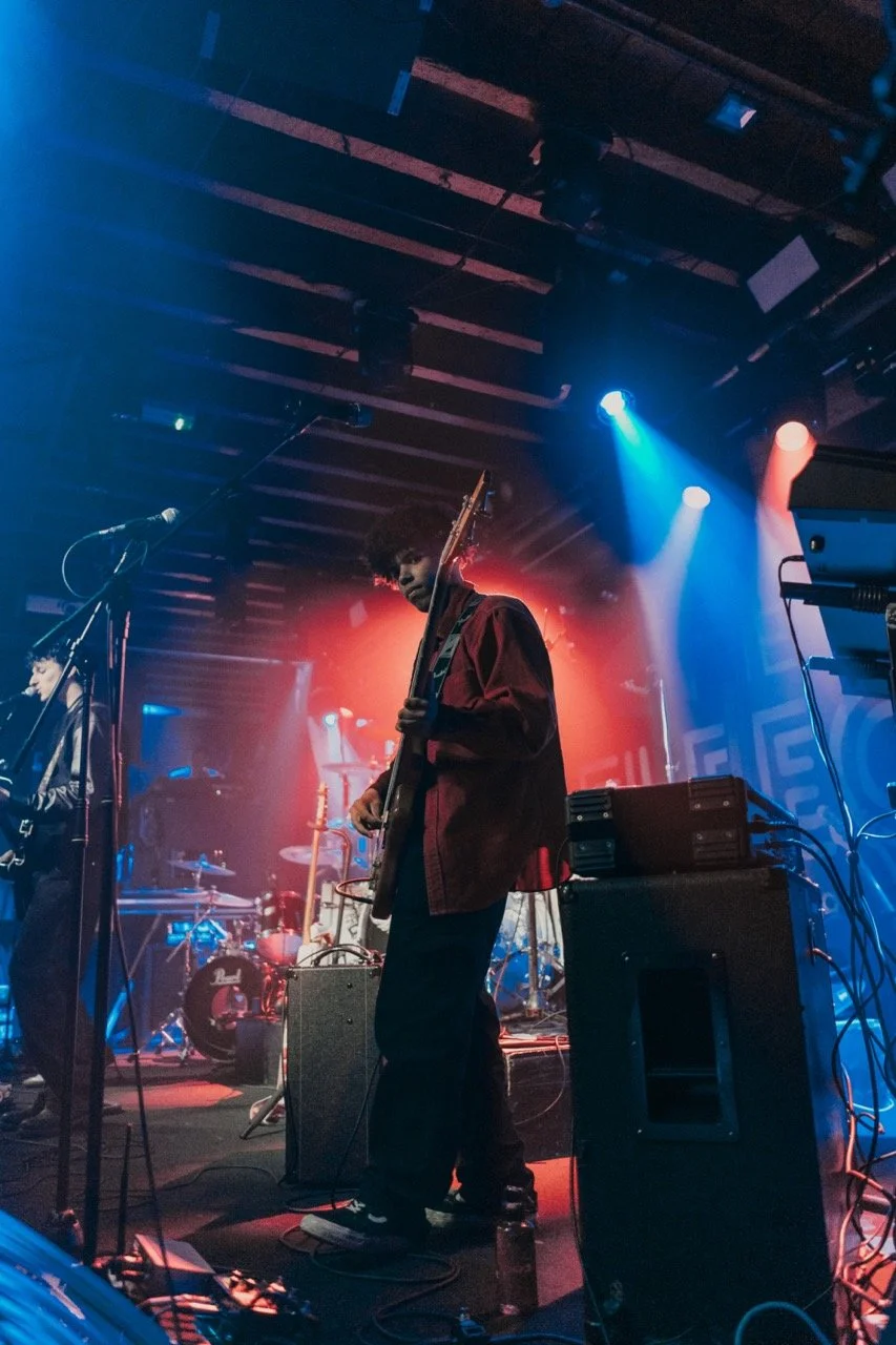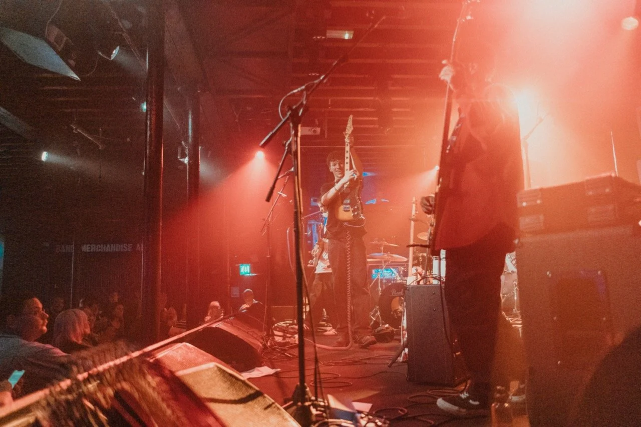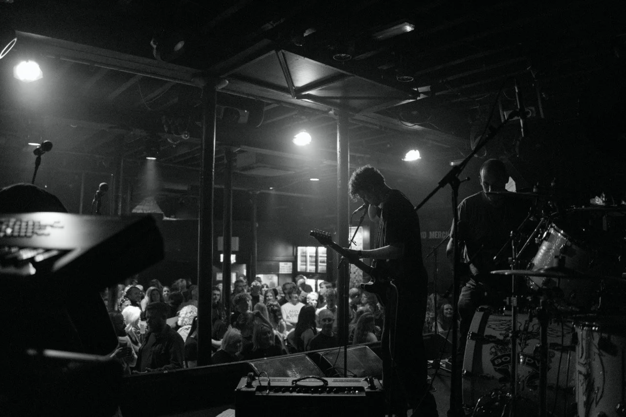 A live music performance in a dimly lit venue with a band on stage, including a guitarist and a drummer, facing an audience. View fullsize