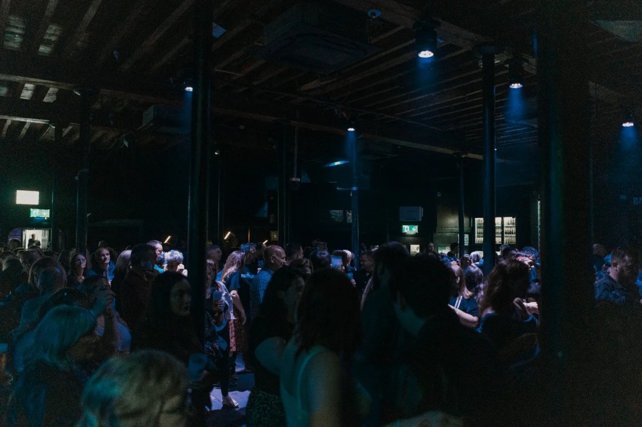 Crowd of people dancing and socializing in a dimly lit nightclub or concert venue with blue overhead lighting.