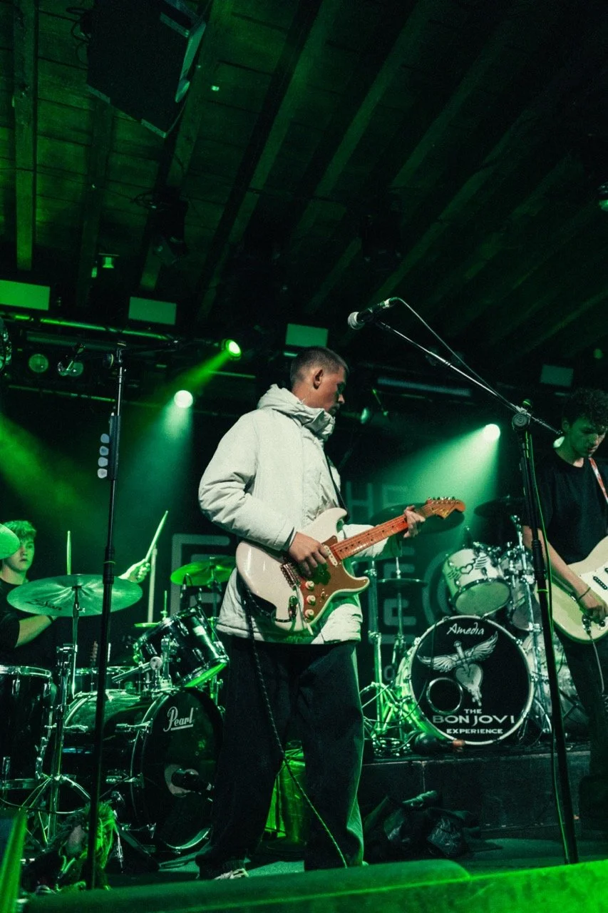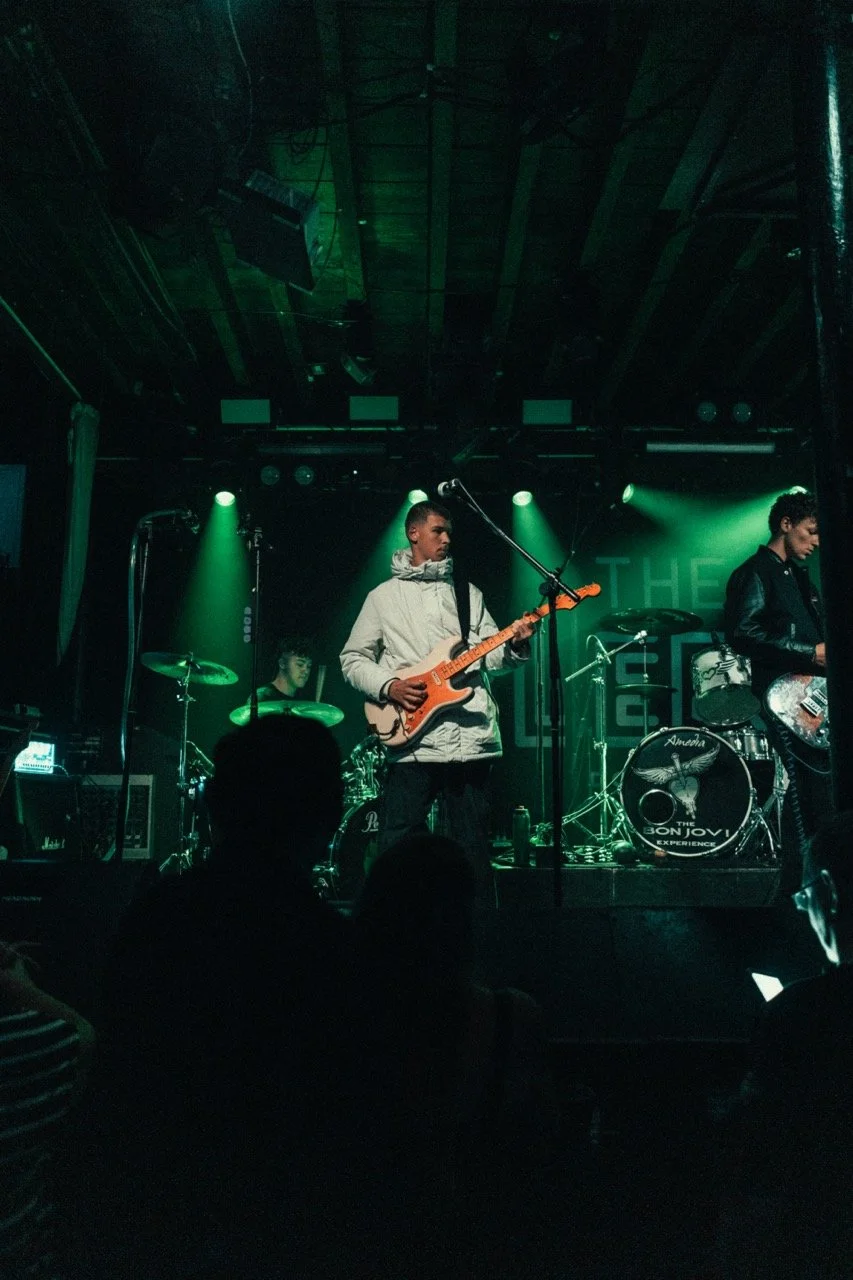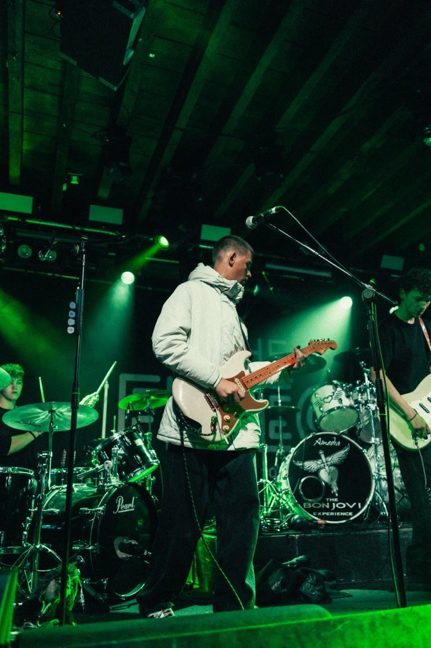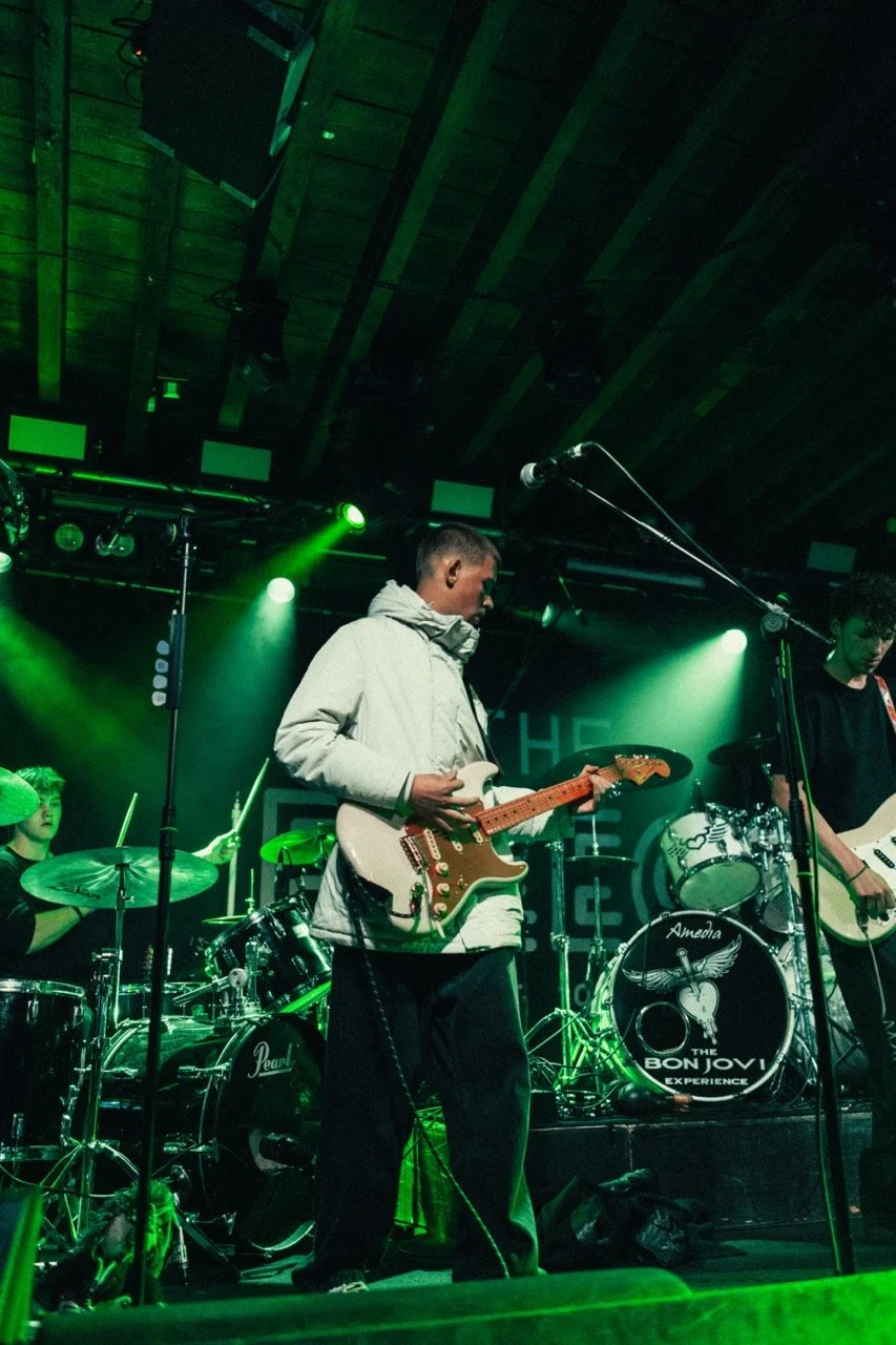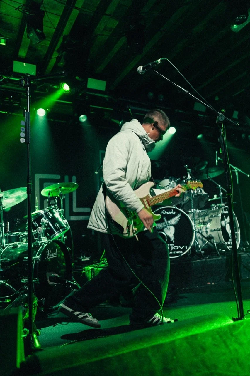 A band performing on stage with green lighting, including a guitarist in a white jacket, a drummer in the background, and a bassist on the right, with an audience watching.