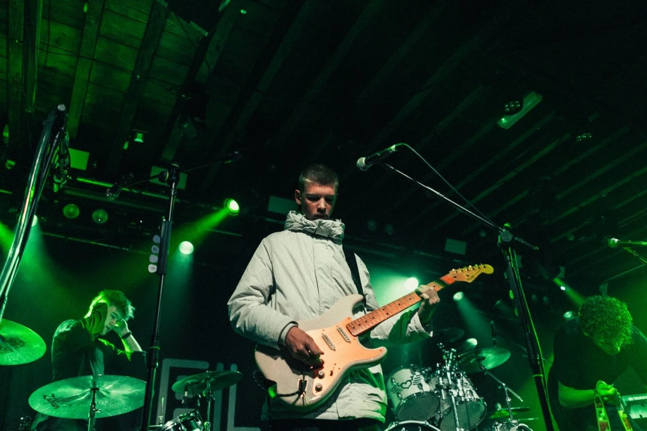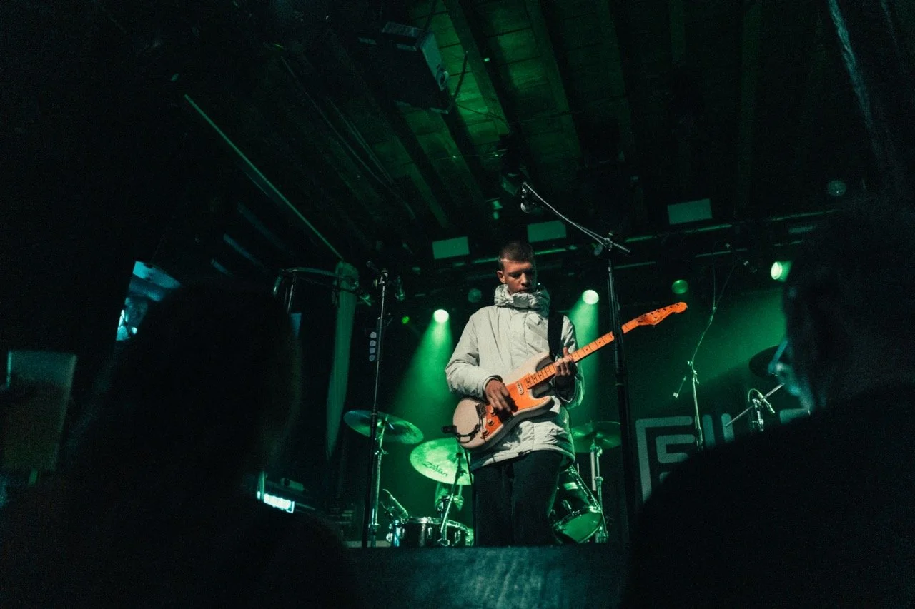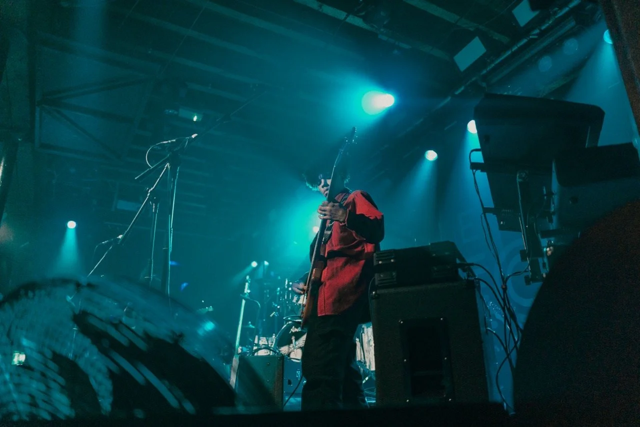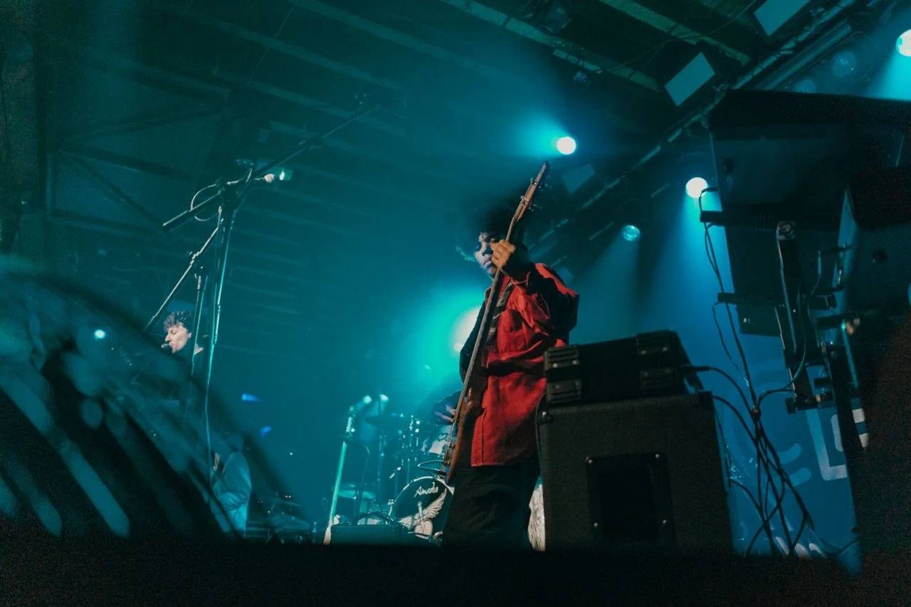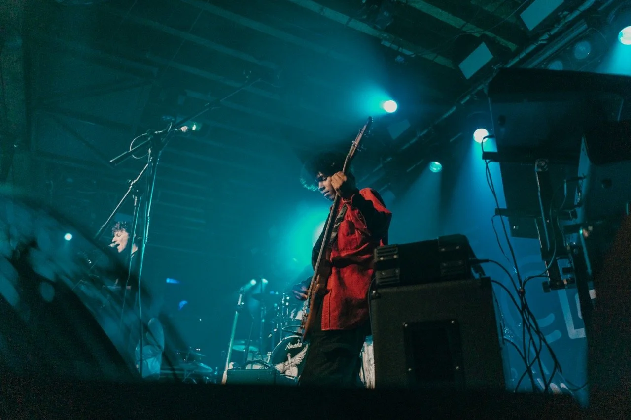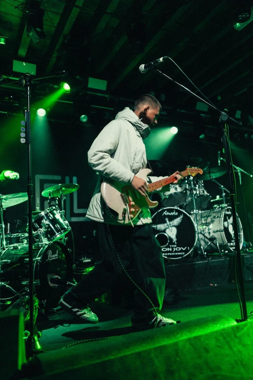 A band performing on stage with green lighting, including a guitarist in a white jacket, a drummer in the background, and a bassist on the right, with an audience watching.