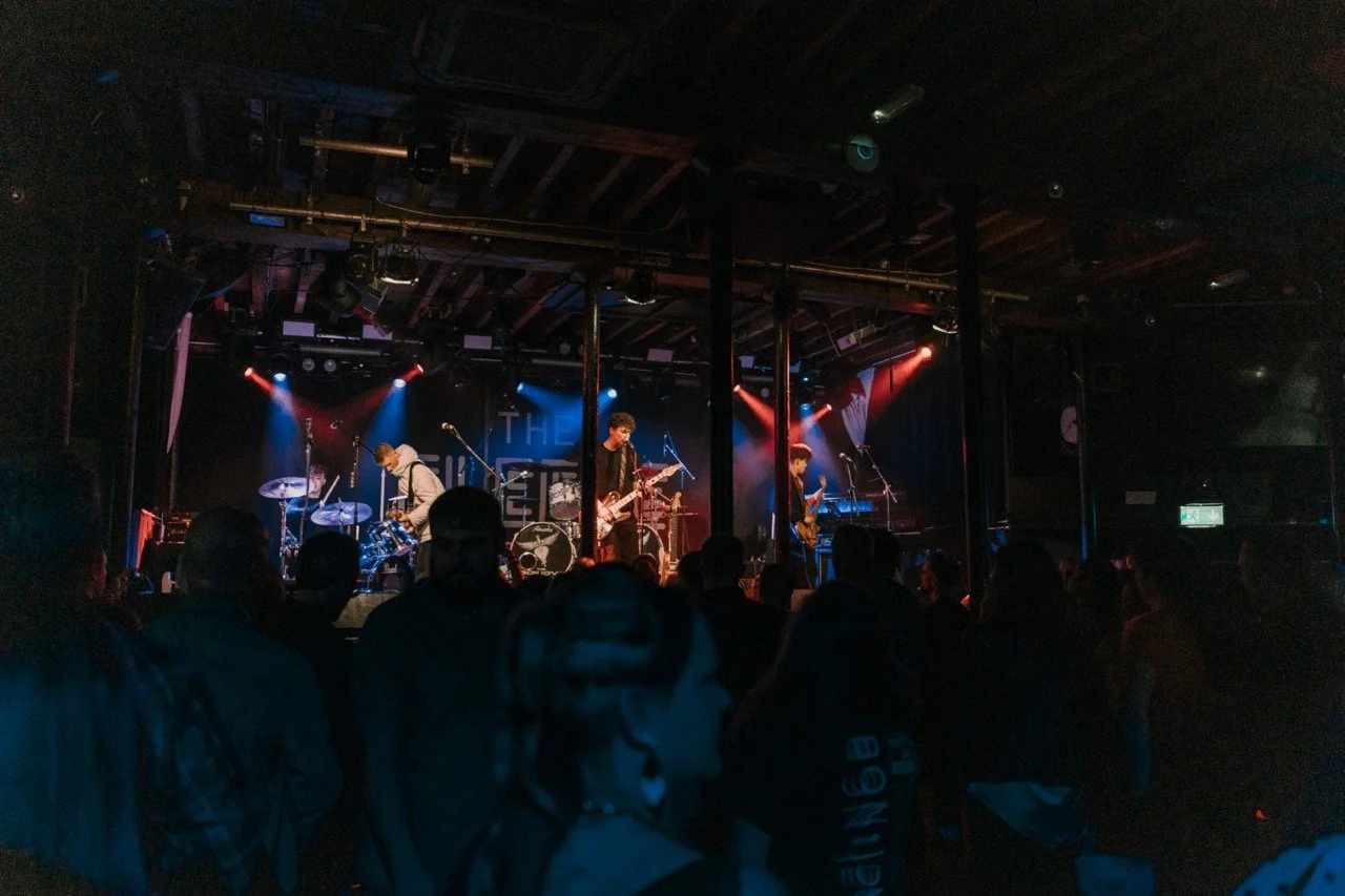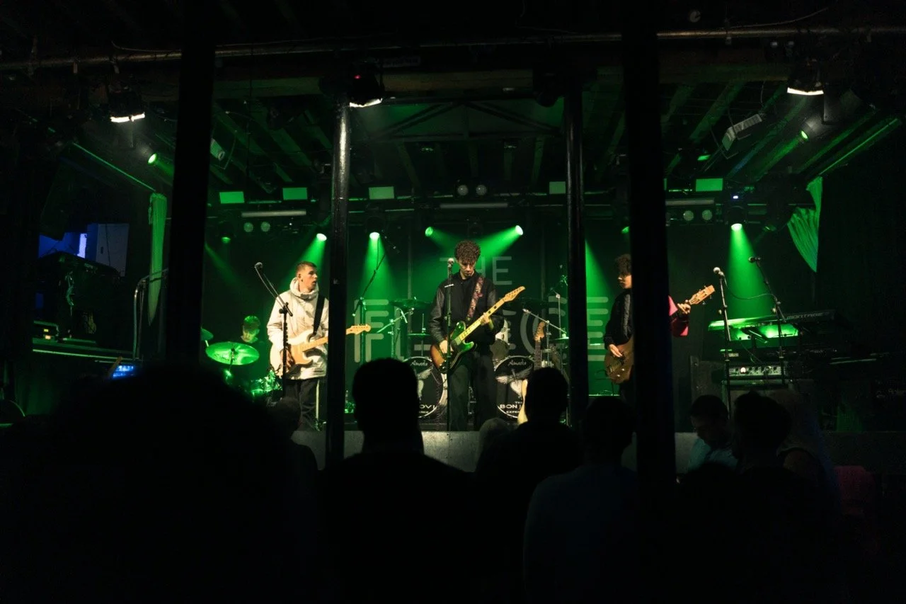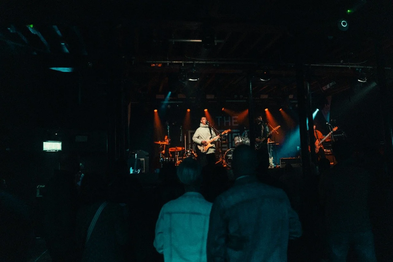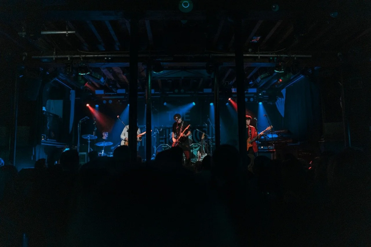 A band performs on stage with four members playing instruments under stage lights, in a dimly lit music venue with audience members in the foreground.