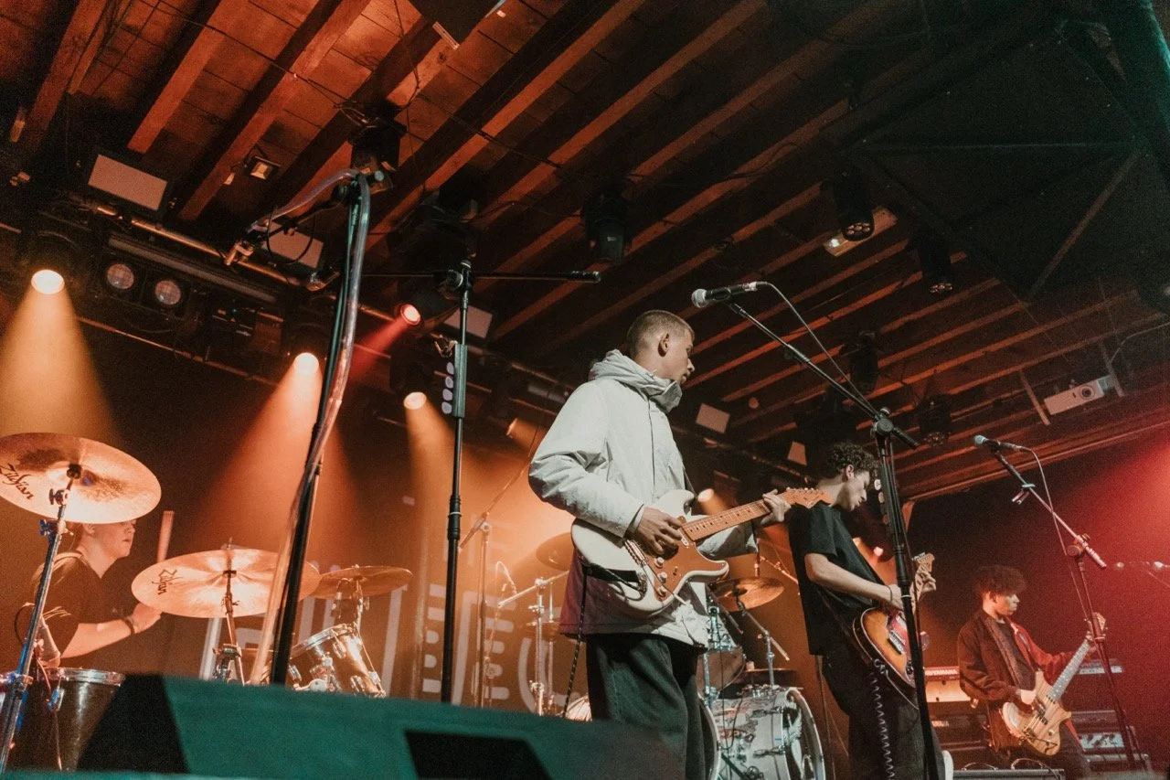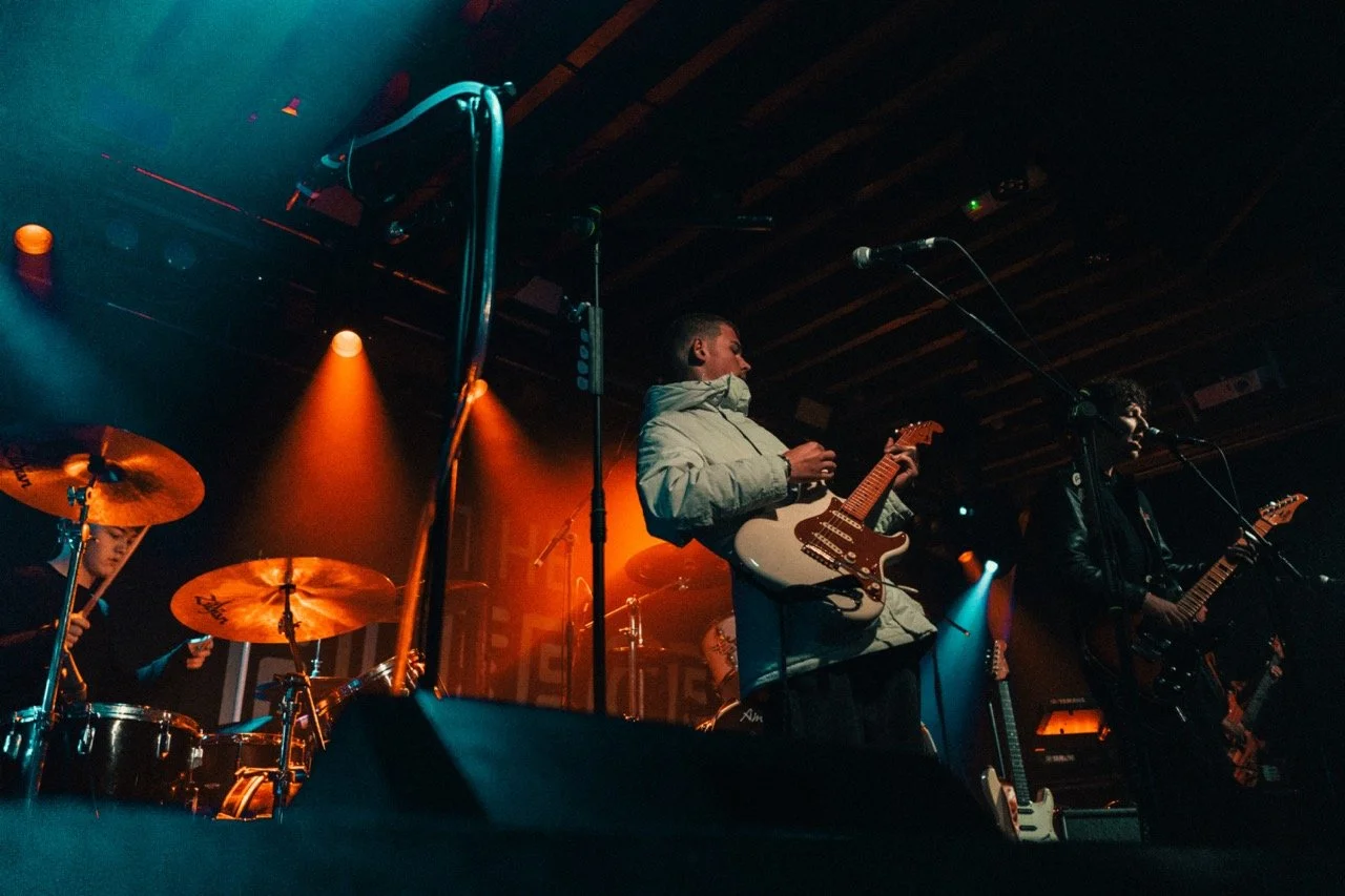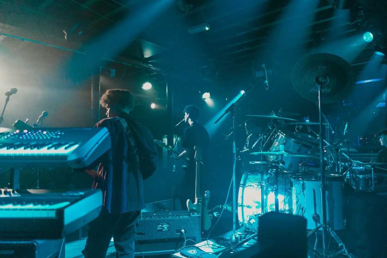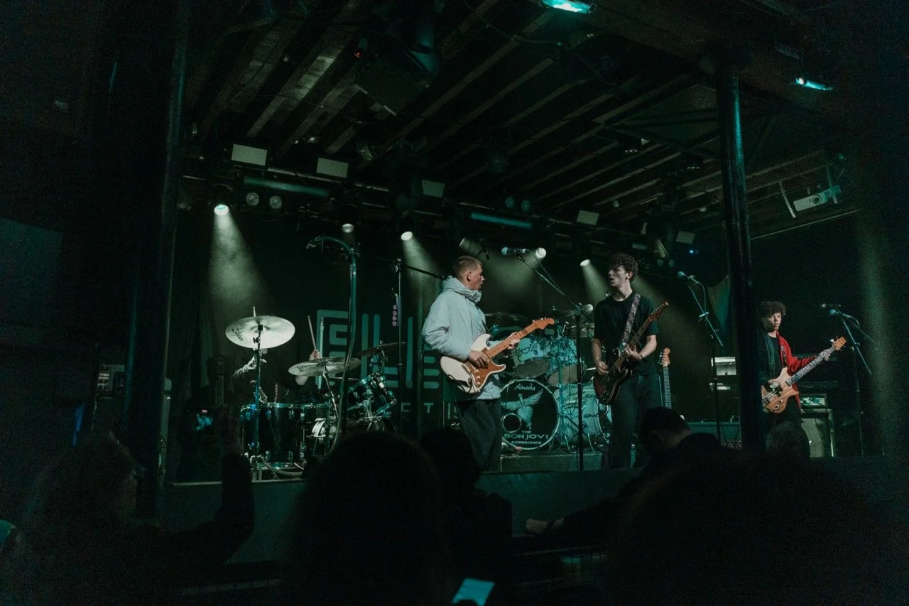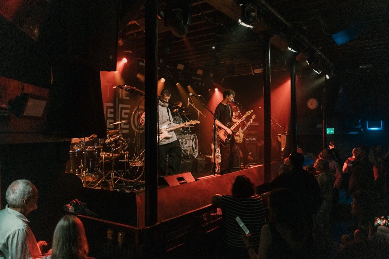 A band performs on stage with four members playing instruments under stage lights, in a dimly lit music venue with audience members in the foreground.