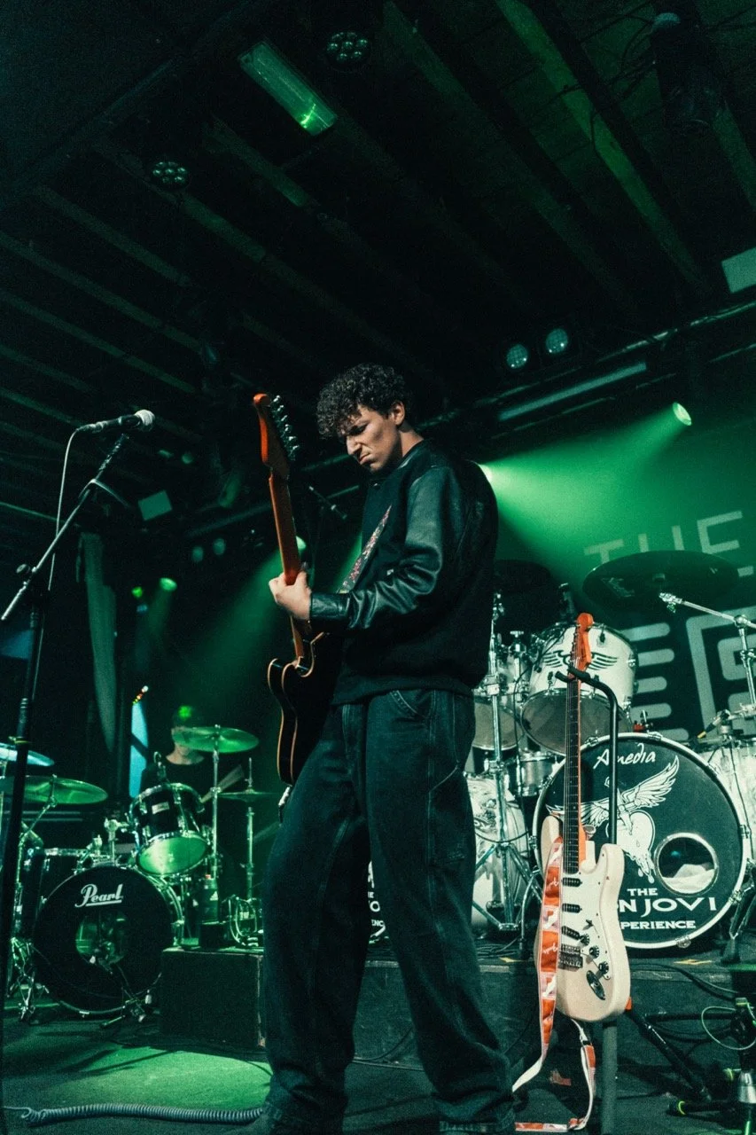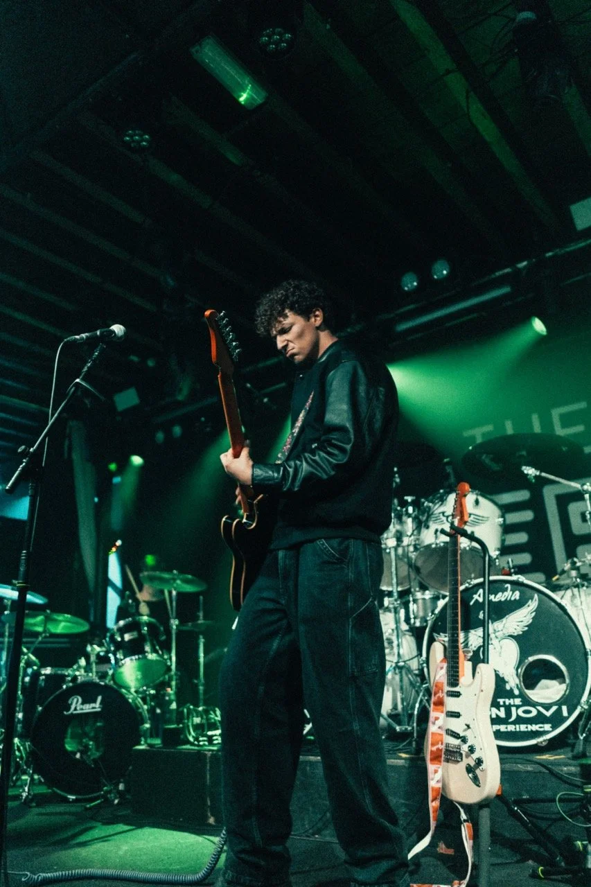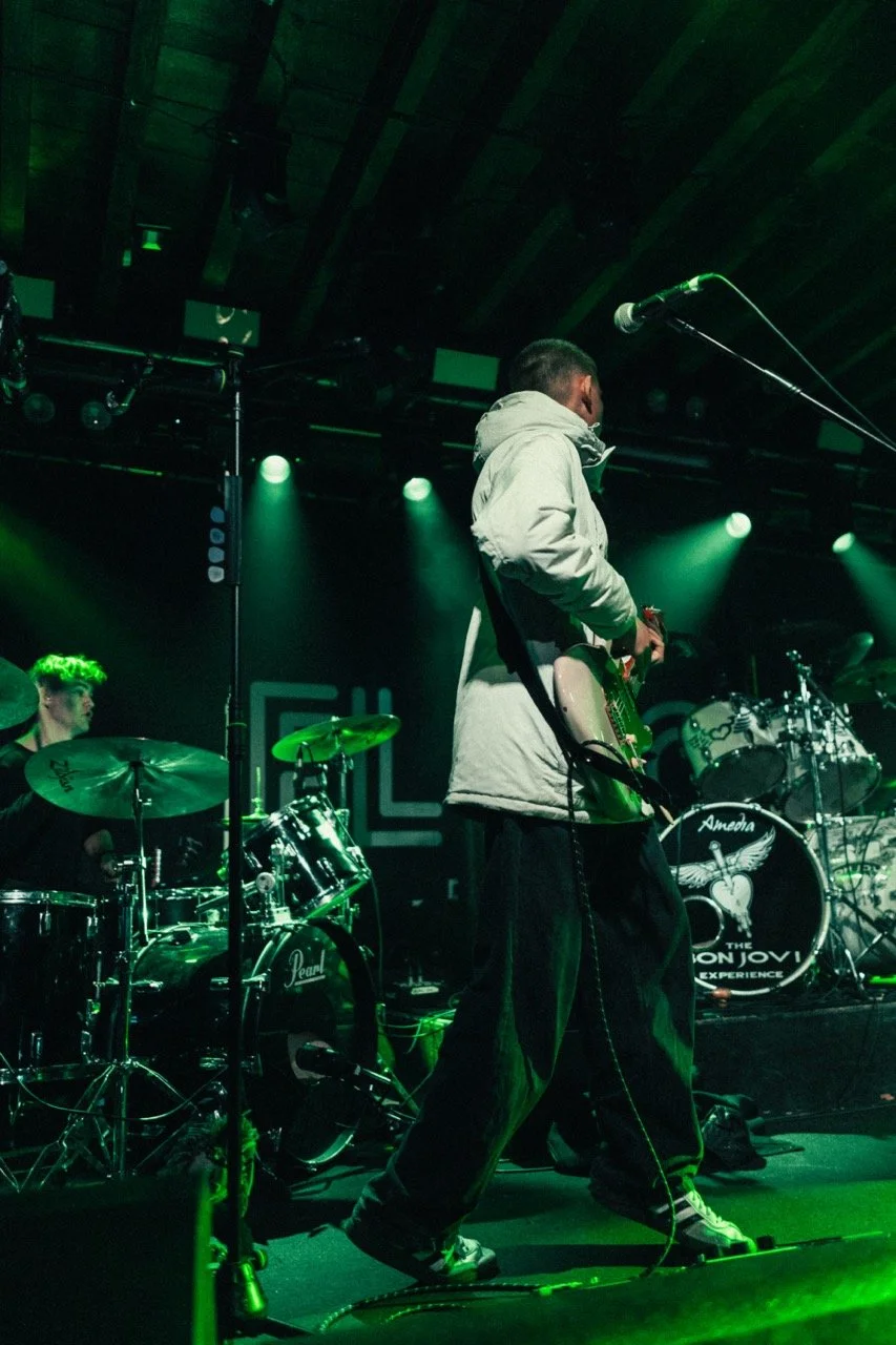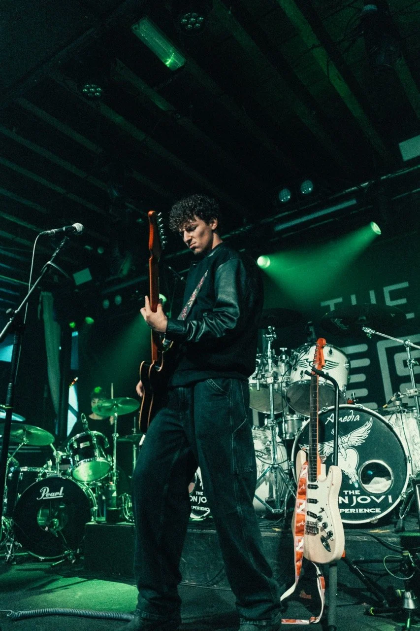 A male musician playing an electric guitar on stage, with a drum set in the background, under green stage lighting.