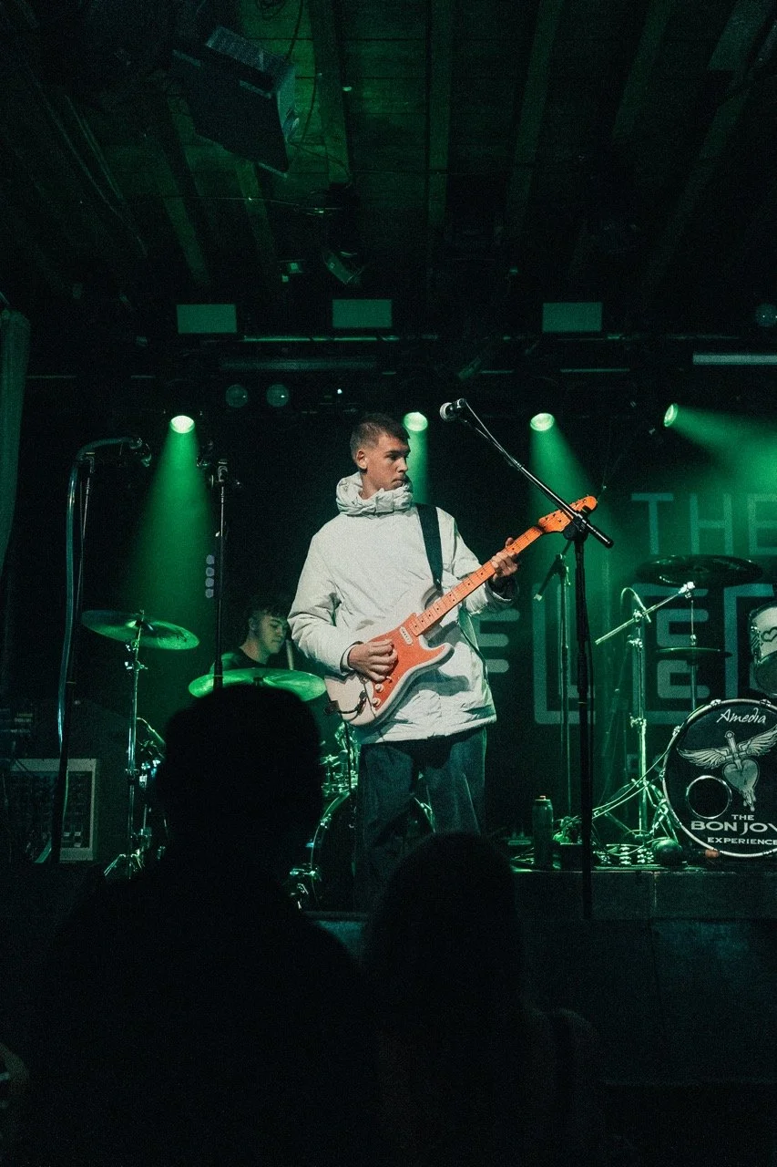 A young musician on stage playing an orange electric guitar, with drums in the background, under green stage lights, during a live performance. View fullsize
