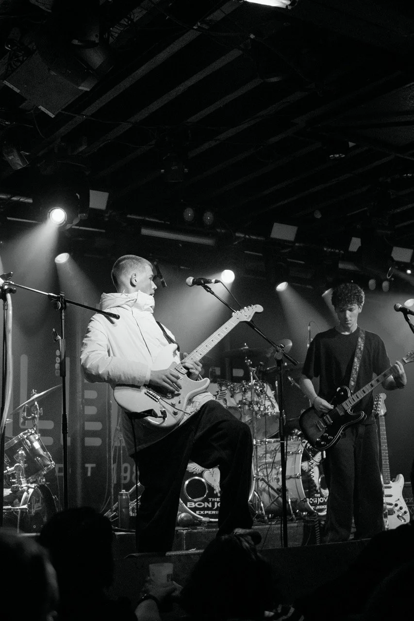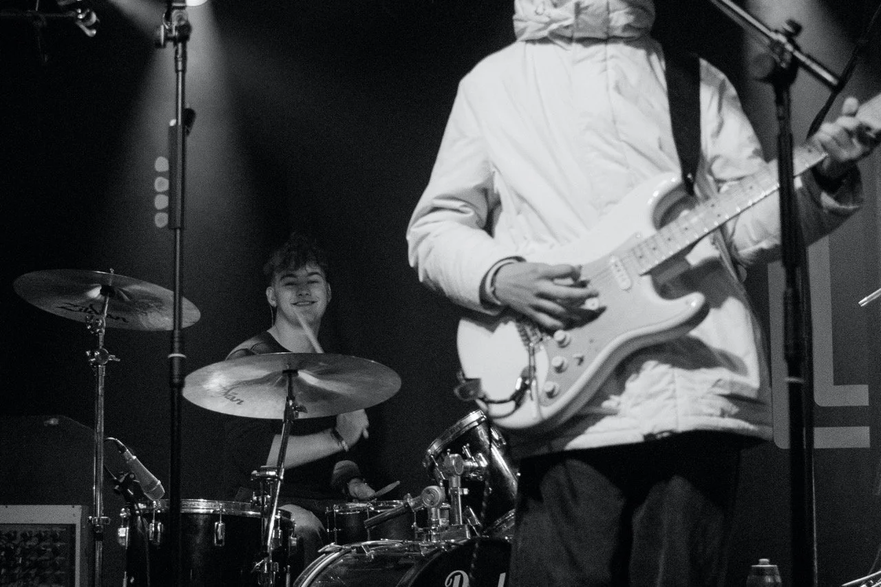 A black and white photo of two young musicians performing on stage. One is playing drums and smiling, the other is playing an electric guitar and dressed in a hooded jacket.