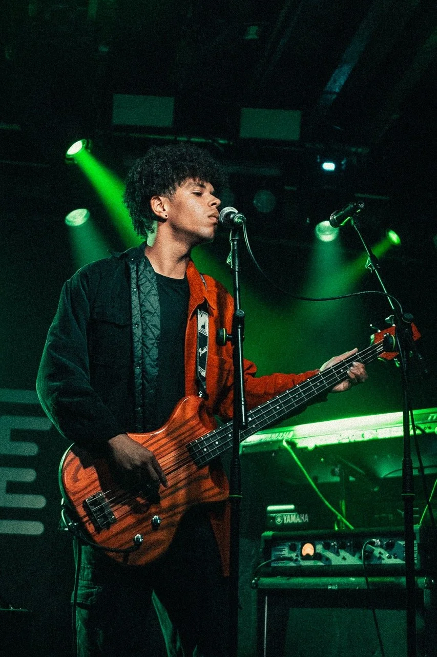 A musician playing an electric bass guitar on stage, with green stage lights and musical equipment in the background. View fullsize