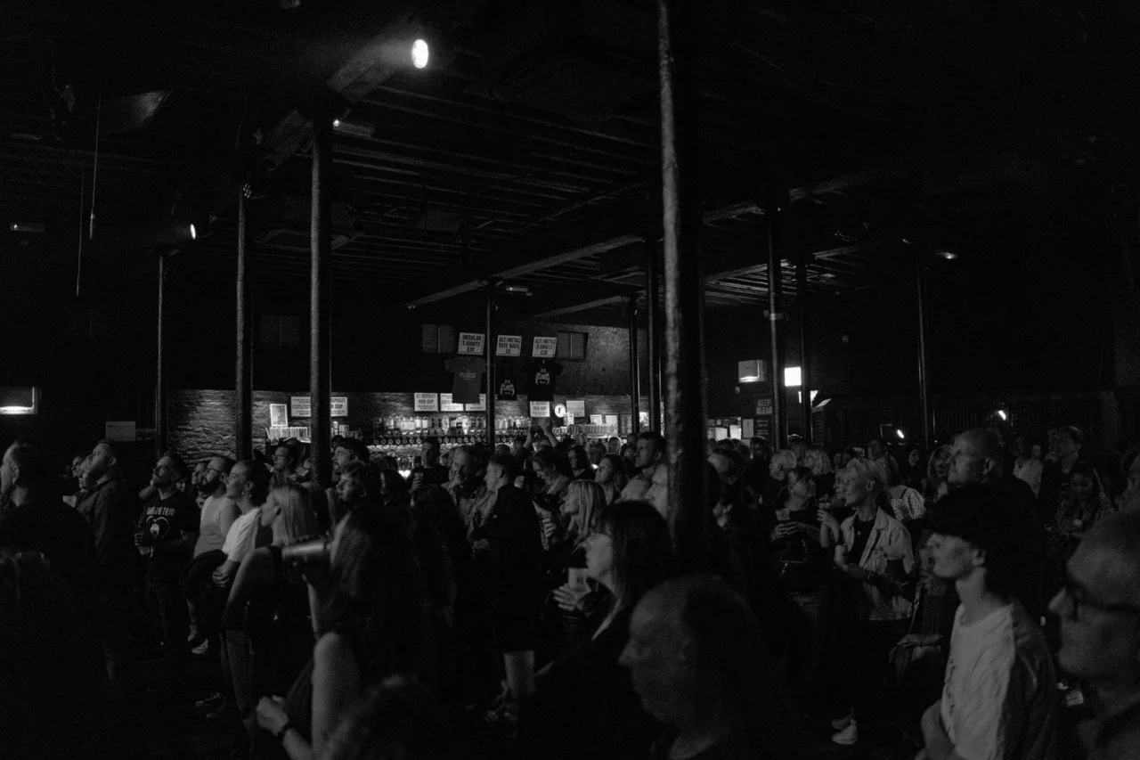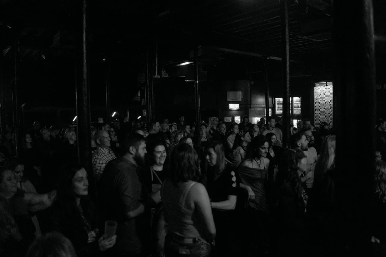 A black and white photo of a large crowd of people standing and watching a performance in a dimly lit venue.