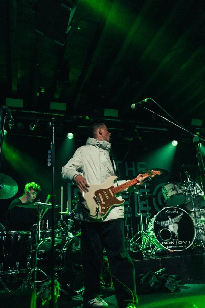 Band performing on a stage with green lighting, featuring a drummer, a guitarist in a white jacket, and another guitarist. View fullsize