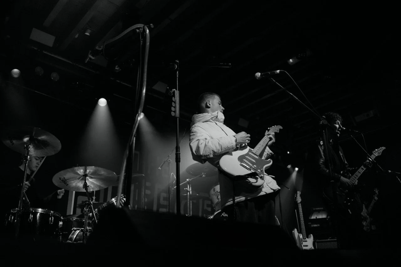 Black and white photo of a live band performance on stage with musicians playing guitars and drums, illuminated by stage lighting.