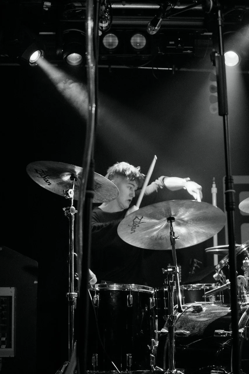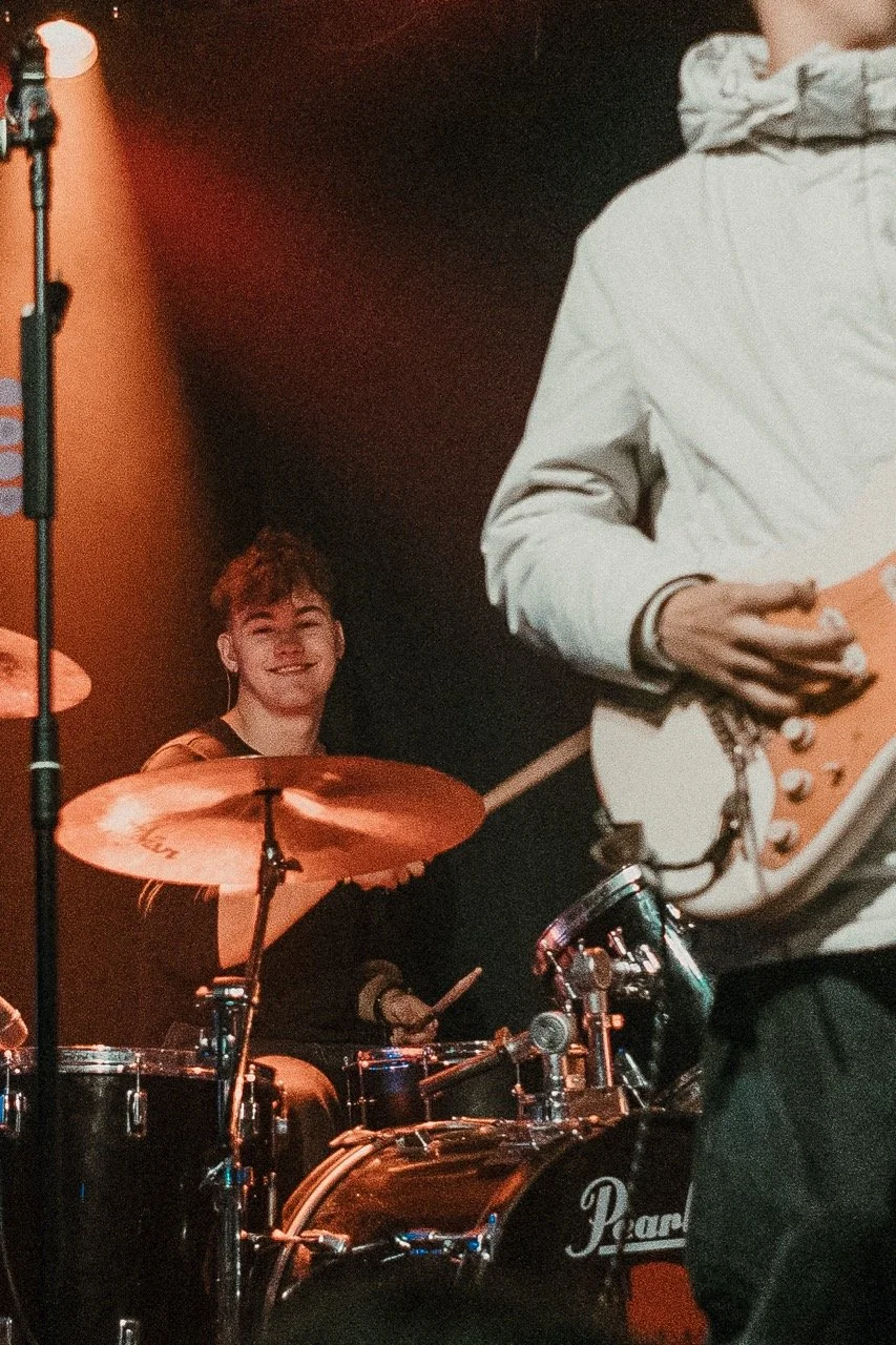 A young man with curly hair smiling and playing drums during a live music performance, with part of a person playing an electric guitar visible in the foreground.