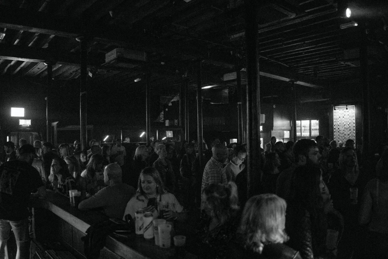 Dark indoor concert venue or nightclub with a crowd of people socializing and enjoying drinks.