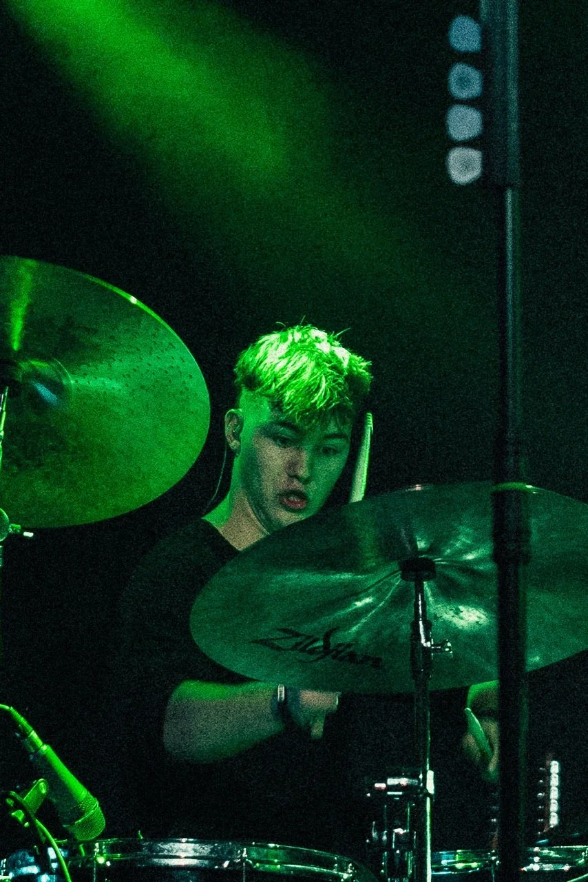 A young man with green hair playing the drums on stage with green lighting. View fullsize