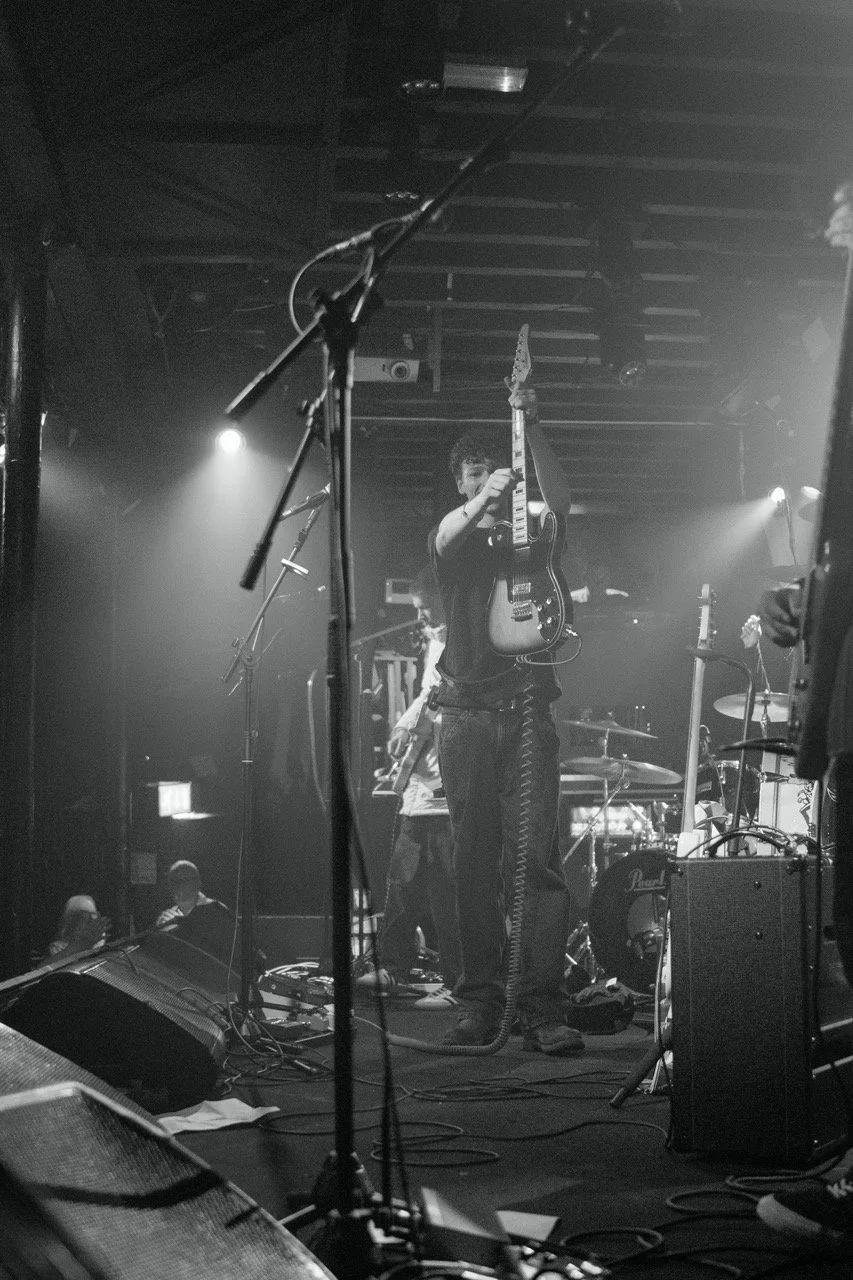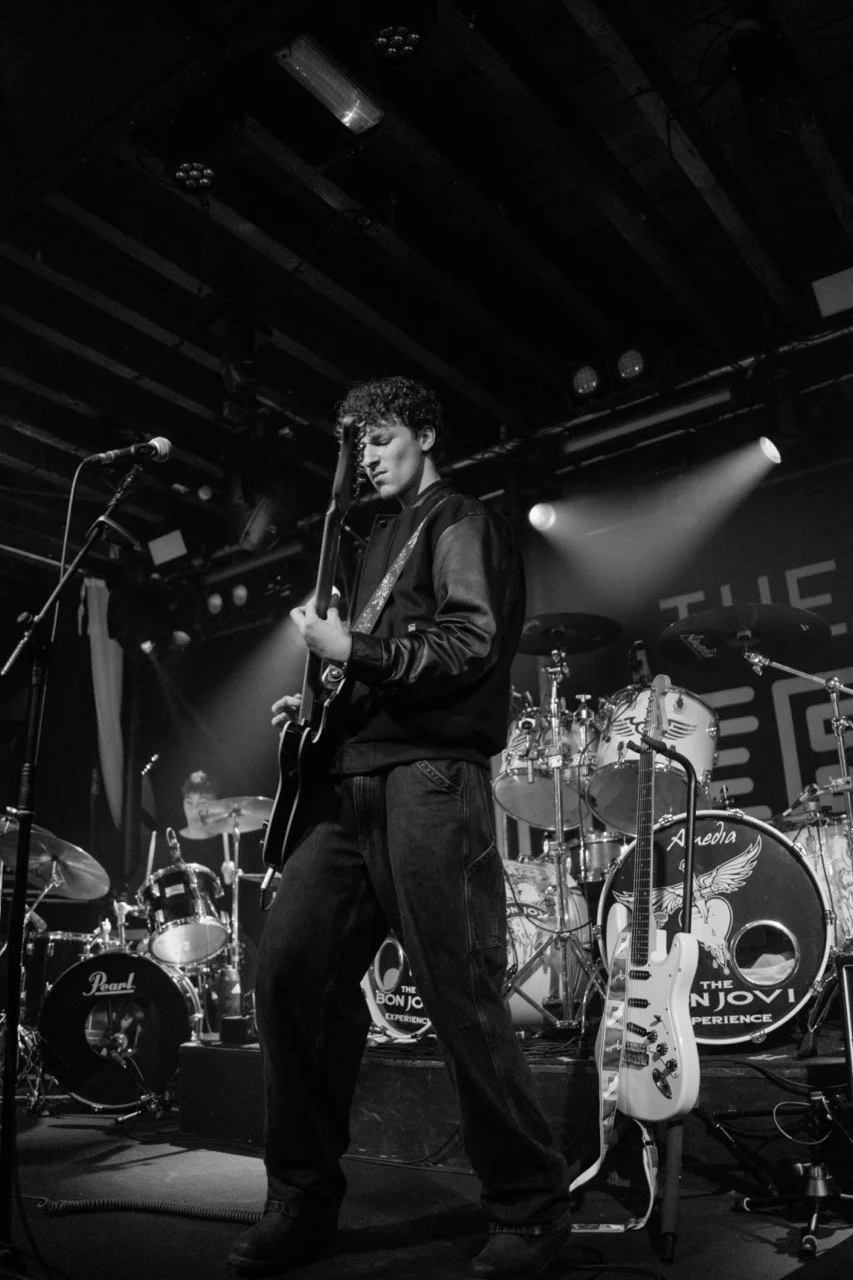Black and white photo of a live band performance on stage with musicians playing guitars and drums, illuminated by stage lighting. View fullsize